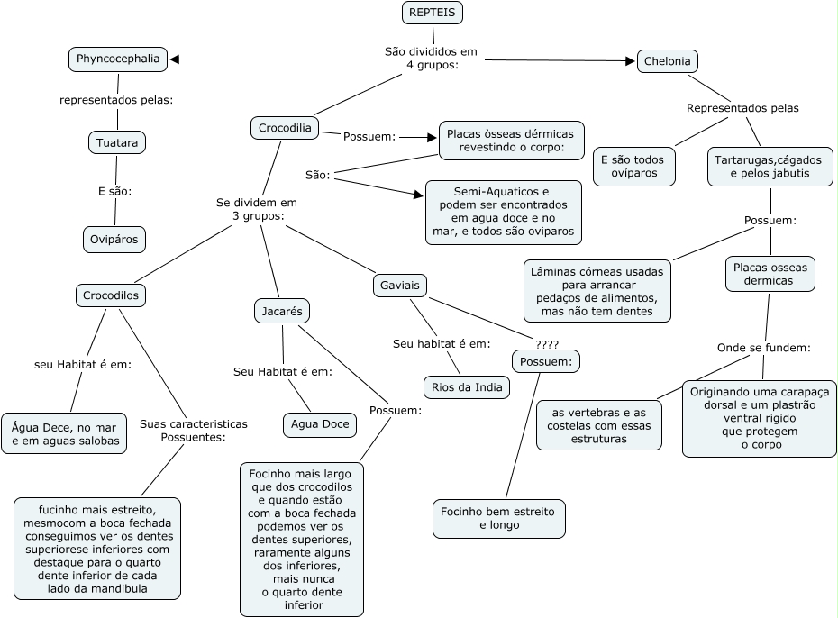 Esse mapa conceitual, produzido no IHMC CmapTools, tem a informação relacionada a: REPTEIS parte2, Tartarugas,cágados e pelos jabutis Possuem: Lâminas córneas usadas para arrancar pedaços de alimentos, mas não tem dentes, Placas osseas dermicas Onde se fundem: Originando uma carapaça dorsal e um plastrão ventral rigido que protegem o corpo, Gaviais ???? Focinho bem estreito e longo, Gaviais Seu habitat é em: Rios da India, Placas òsseas dérmicas revestindo o corpo: São: Semi-Aquaticos e podem ser encontrados em agua doce e no mar, e todos são oviparos, Crocodilia Se dividem em 3 grupos: Crocodilos, REPTEIS São divididos em 4 grupos: Phyncocephalia, Chelonia Representados pelas E são todos ovíparos, Tuatara E são: Ovipáros, REPTEIS São divididos em 4 grupos: Chelonia, Tartarugas,cágados e pelos jabutis Possuem: Placas osseas dermicas, Crocodilos seu Habitat é em: Água Dece, no mar e em aguas salobas, Placas osseas dermicas Onde se fundem: as vertebras e as costelas com essas estruturas, Crocodilia Possuem: Placas òsseas dérmicas revestindo o corpo:, Phyncocephalia representados pelas: Tuatara, Chelonia Representados pelas Tartarugas,cágados e pelos jabutis, Jacarés Seu Habitat é em: Agua Doce, Jacarés Possuem: Focinho mais largo que dos crocodilos e quando estão com a boca fechada podemos ver os dentes superiores, raramente alguns dos inferiores, mais nunca o quarto dente inferior, Crocodilia Se dividem em 3 grupos: Gaviais, Crocodilos Suas caracteristicas Possuentes: fucinho mais estreito, mesmocom a boca fechada conseguimos ver os dentes superiorese inferiores com destaque para o quarto dente inferior de cada lado da mandibula