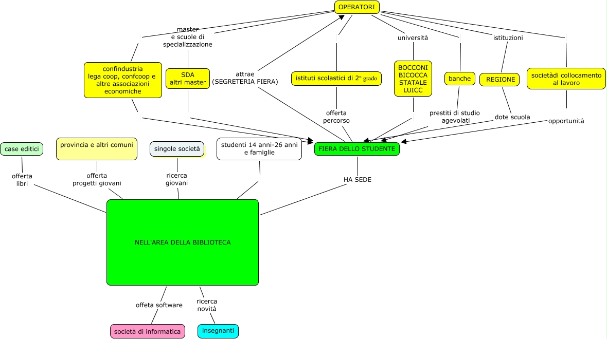 Questa Cmap, creata con IHMC CmapTools, contiene informazioni relative a: fs, societàdi collocamento al lavoro opportunità FIERA DELLO STUDENTE, OPERATORI istituzioni REGIONE, OPERATORI societàdi collocamento al lavoro, confindustria lega coop, confcoop e altre associazioni economiche FIERA DELLO STUDENTE, OPERATORI banche, REGIONE dote scuola FIERA DELLO STUDENTE, studenti 14 anni-26 anni e famiglie NELL'AREA DELLA BIBLIOTECA, provincia e altri comuni offerta progetti giovani NELL'AREA DELLA BIBLIOTECA, singole società ricerca giovani NELL'AREA DELLA BIBLIOTECA, OPERATORI confindustria lega coop, confcoop e altre associazioni economiche, OPERATORI istituti scolastici di 2° grado, BOCCONI BICOCCA STATALE LUICC FIERA DELLO STUDENTE, FIERA DELLO STUDENTE HA SEDE NELL'AREA DELLA BIBLIOTECA, OPERATORI università BOCCONI BICOCCA STATALE LUICC, istituti scolastici di 2° grado offerta percorso FIERA DELLO STUDENTE, SDA altri master FIERA DELLO STUDENTE, banche prestiti di studio agevolati FIERA DELLO STUDENTE, case editici offerta libri NELL'AREA DELLA BIBLIOTECA, NELL'AREA DELLA BIBLIOTECA offeta software società di informatica, NELL'AREA DELLA BIBLIOTECA ricerca novità insegnanti