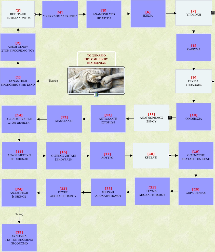 XENIA, [1] ΣΥΝΑΝΤΗΣΗ ΠΡΟΠΟΜΠΟΥ ΜΕ ΞΕΝΟ [2] ΑΦΙΞΗ ΞΕΝΟΥ ΣΤΟΝ ΠΡΟΟΡΙΣΜΟ ΤΟΥ, [7.1] Ο ξενιστής βλέπει τον ξένο [7.2] διστάζει να προσφέρει φιλοξενία, [8] ΚΑΘΙΣΜΑ [9] ΓΕΥΜΑ ΥΠΟΔΟΧΗΣ, [18] ΚΡΕΒΑΤΙ [18.2] ύπνος, [7.6] παίρνει από το χέρι τον ξένο [7.7] καλοσωρίζει τον ξένο, [9] ΓΕΥΜΑ ΥΠΟΔΟΧΗΣ [9.2] κατανάλωση τροφής, [2] ΑΦΙΞΗ ΞΕΝΟΥ ΣΤΟΝ ΠΡΟΟΡΙΣΜΟ ΤΟΥ [3] ΠΕΡΙΓΡΑΦΗ ΠΕΡΙΒΑΛΛΟΝΤΟΣ, Έναρξη [1] ΣΥΝΑΝΤΗΣΗ ΠΡΟΠΟΜΠΟΥ ΜΕ ΞΕΝΟ, εναλλακτικά [3.2] δραστηριότητας του ξενιστή, [10] ΟΙΝΟΠΟΣΙΑ [11] ΑΝΑΓΝΩΡΙΣΜΟΣ ΞΕΝΟΥ