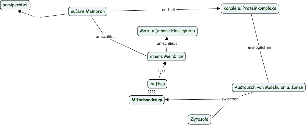 Dieses mit IHMC CmapTools erstellte CMap hat Informationen bezüglich: Bio-Mitochondrium, äußere Membran ist semiperabel, Kanäle u. Proteinkomplexe ermöglichen Austausch von Molekülen u. Ionen, Austausch von Molekülen u. Ionen zwischen Zytosole, äußere Membran umschlißt innere Membran, äußere Membran enthält Kanäle u. Proteinkomplexe, Aufbau ???? innere Membran, Austausch von Molekülen u. Ionen zwischen Mitochondrium, Mitochondrium ???? Aufbau, innere Membran umschließt Matrix (innere Flüssigkeit)