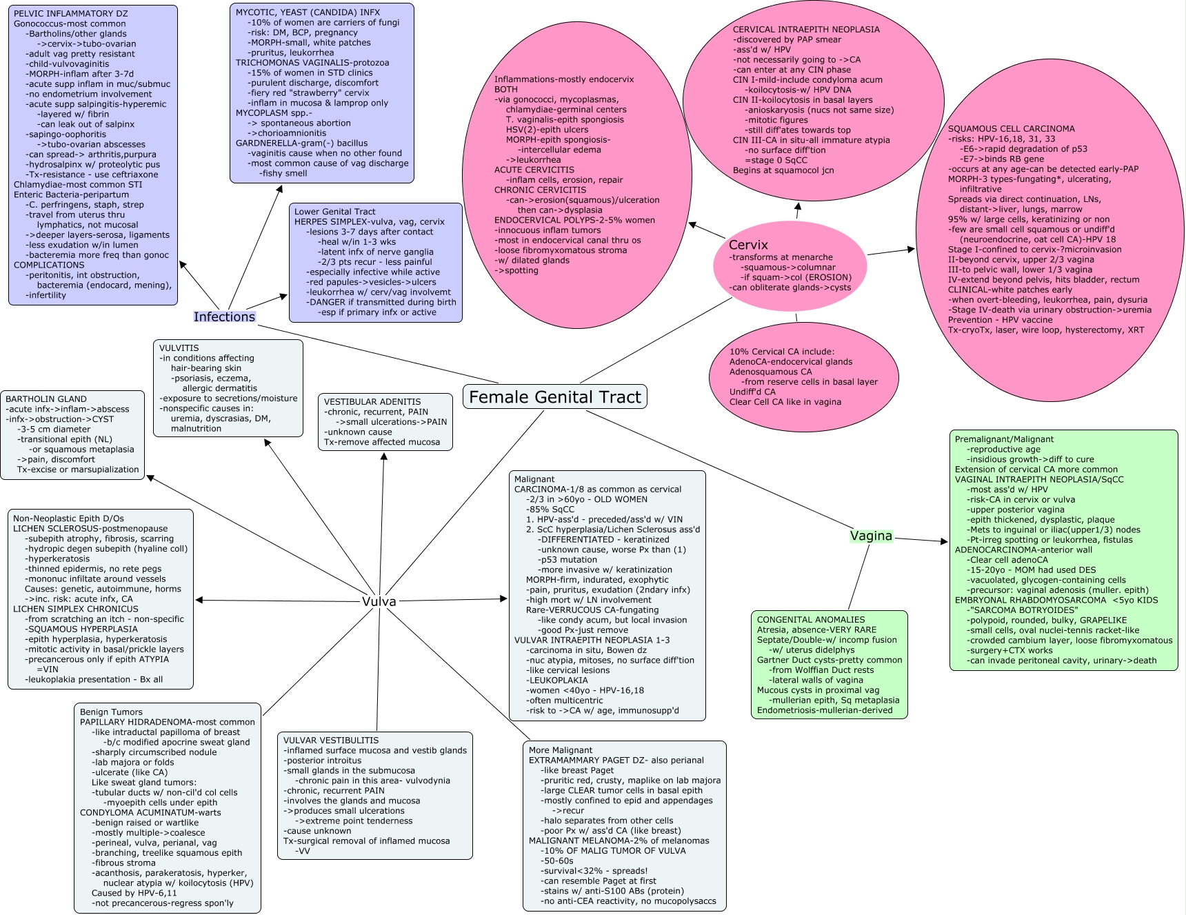 This Concept Map, created with IHMC CmapTools, has information related to: Female Lower Genital Tract, Female Genital Tract Vulva Benign Tumors PAPILLARY HIDRADENOMA-most common -like intraductal papilloma of breast -b/c modified apocrine sweat gland -sharply circumscribed nodule -lab majora or folds -ulcerate (like CA) Like sweat gland tumors: -tubular ducts w/ non-cil'd col cells -myoepith cells under epith CONDYLOMA ACUMINATUM-warts -benign raised or wartlike -mostly multiple->coalesce -perineal, vulva, perianal, vag -branching, treelike squamous epith -fibrous stroma -acanthosis, parakeratosis, hyperker, nuclear atypia w/ koilocytosis (HPV) Caused by HPV-6,11 -not precancerous-regress spon'ly, Female Genital Tract Cervix -transforms at menarche -squamous->columnar -if squam->col (EROSION) -can obliterate glands->cysts Inflammations-mostly endocervix BOTH -via gonococci, mycoplasmas, chlamydiae-germinal centers T. vaginalis-epith spongiosis HSV(2)-epith ulcers MORPH-epith spongiosis- -intercellular edema ->leukorrhea ACUTE CERVICITIS -inflam cells, erosion, repair CHRONIC CERVICITIS -can->erosion(squamous)/ulceration then can->dysplasia ENDOCERVICAL POLYPS-2-5% women -innocuous inflam tumors -most in endocervical canal thru os -loose fibromyxomatous stroma -w/ dilated glands ->spotting, Female Genital Tract Vulva More Malignant EXTRAMAMMARY PAGET DZ- also perianal -like breast Paget -pruritic red, crusty, maplike on lab majora -large CLEAR tumor cells in basal epith -mostly confined to epid and appendages ->recur -halo separates from other cells -poor Px w/ ass'd CA (like breast) MALIGNANT MELANOMA-2% of melanomas -10% OF MALIG TUMOR OF VULVA -50-60s -survivalថ% - spreads! -can resemble Paget at first -stains w/ anti-S100 ABs (protein) -no anti-CEA reactivity, no mucopolysaccs, Female Genital Tract Vulva VESTIBULAR ADENITIS -chronic, recurrent, PAIN ->small ulcerations->PAIN -unknown cause Tx-remove affected mucosa, Female Genital Tract Infections PELVIC INFLAMMATORY DZ Gonococcus-most common -Bartholins/other glands ->cervix->tubo-ovarian -adult vag pretty resistant -child-vulvovaginitis -MORPH-inflam after 3-7d -acute supp inflam in muc/submuc -no endometrium involvement -acute supp salpingitis-hyperemic -layered w/ fibrin -can leak out of salpinx -sapingo-oophoritis ->tubo-ovarian abscesses -can spread-> arthritis,purpura -hydrosalpinx w/ proteolytic pus -Tx-resistance - use ceftriaxone Chlamydiae-most common STI Enteric Bacteria-peripartum -C. perfringens, staph, strep -travel from uterus thru lymphatics, not mucosal ->deeper layers-serosa, ligaments -less exudation w/in lumen -bacteremia more freq than gonoc COMPLICATIONS -peritonitis, int obstruction, bacteremia (endocard, mening), -infertility, Female Genital Tract Vulva Non-Neoplastic Epith D/Os LICHEN SCLEROSUS-postmenopause -subepith atrophy, fibrosis, scarring -hydropic degen subepith (hyaline coll) -hyperkeratosis -thinned epidermis, no rete pegs -mononuc infiltate around vessels Causes: genetic, autoimmune, horms ->inc. risk: acute infx, CA LICHEN SIMPLEX CHRONICUS -from scratching an itch - non-specific -SQUAMOUS HYPERPLASIA -epith hyperplasia, hyperkeratosis -mitotic activity in basal/prickle layers -precancerous only if epith ATYPIA =VIN -leukoplakia presentation - Bx all, Female Genital Tract Cervix -transforms at menarche -squamous->columnar -if squam->col (EROSION) -can obliterate glands->cysts 10% Cervical CA include: AdenoCA-endocervical glands Adenosquamous CA -from reserve cells in basal layer Undiff'd CA Clear Cell CA like in vagina, Female Genital Tract Vulva VULVITIS -in conditions affecting hair-bearing skin -psoriasis, eczema, allergic dermatitis -exposure to secretions/moisture -nonspecific causes in: uremia, dyscrasias, DM, malnutrition, Female Genital Tract Infections Lower Genital Tract HERPES SIMPLEX-vulva, vag, cervix -lesions 3-7 days after contact -heal w/in 1-3 wks -latent infx of nerve ganglia -2/3 pts recur - less painful -especially infective while active -red papules->vesicles->ulcers -leukorrhea w/ cerv/vag involvemt -DANGER if transmitted during birth -esp if primary infx or active, Female Genital Tract Cervix -transforms at menarche -squamous->columnar -if squam->col (EROSION) -can obliterate glands->cysts SQUAMOUS CELL CARCINOMA -risks: HPV-16,18, 31, 33 -E6->rapid degradation of p53 -E7->binds RB gene -occurs at any age-can be detected early-PAP MORPH-3 types-fungating*, ulcerating, infiltrative Spreads via direct continuation, LNs, distant->liver, lungs, marrow 95% w/ large cells, keratinizing or non -few are small cell squamous or undiff'd (neuroendocrine, oat cell CA)-HPV 18 Stage I-confined to cervix-?microinvasion II-beyond cervix, upper 2/3 vagina III-to pelvic wall, lower 1/3 vagina IV-extend beyond pelvis, hits bladder, rectum CLINICAL-white patches early -when overt-bleeding, leukorrhea, pain, dysuria -Stage IV-death via urinary obstruction->uremia Prevention - HPV vaccine Tx-cryoTx, laser, wire loop, hysterectomy, XRT, Female Genital Tract Vulva BARTHOLIN GLAND -acute infx->inflam->abscess -infx->obstruction->CYST -3-5 cm diameter -transitional epith (NL) -or squamous metaplasia ->pain, discomfort Tx-excise or marsupialization, Female Genital Tract Vulva VULVAR VESTIBULITIS -inflamed surface mucosa and vestib glands -posterior introitus -small glands in the submucosa -chronic pain in this area- vulvodynia -chronic, recurrent PAIN -involves the glands and mucosa ->produces small ulcerations ->extreme point tenderness -cause unknown Tx-surgical removal of inflamed mucosa -VV, Female Genital Tract Cervix -transforms at menarche -squamous->columnar -if squam->col (EROSION) -can obliterate glands->cysts CERVICAL INTRAEPITH NEOPLASIA -discovered by PAP smear -ass'd w/ HPV -not necessarily going to ->CA -can enter at any CIN phase CIN I-mild-include condyloma acum -koilocytosis-w/ HPV DNA CIN II-koilocytosis in basal layers -anioskaryosis (nucs not same size) -mitotic figures -still d