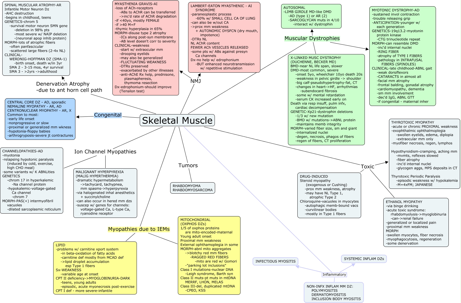 This Concept Map, created with IHMC CmapTools, has information related to: Skeletal Muscle, Skeletal Muscle Myopathies due to IEMs MITOCHONDRIAL (OXPHOS DZs) 1/5 of oxphos proteins are mito-encoded-maternal Young adult onset Proximal mm weakness External ophthamoplegia in some MORPH-abnl mito aggregates ->blotchy red mm fibers -RAGGED RED FIBERS -mito are red w/ Gomori -"parking lot inclusions" Class I mutations-nuclear DNA -Leigh syndrome, Barth syn Class II muts-pt muts in mtDNA MERRF, LHON, MELAS Class III-del, duplicated mtDNA -CPEO, KSS, Skeletal Muscle Inflammatory SYSTEMIC INFLAM DZs, Skeletal Muscle Ion Channel Myopathies CHANNELOPATHIES-AD -myotonia -relapsing hypotonic paralysis (induced by cold, exercise, high CHO meal) -some variants w/ K ABNLities GENETICS -chrom 17 in hyperkalemic -Na channel protein -hypokalemic-voltage-gated Ca channel -chrom 7 MORPH-PAS(+) intermyofibril vacuoles -dilated sarcoplasmic reticulum, Skeletal Muscle Muscular Dystrophies X-LINKED MUSC DYSTROPHY (DUCHENNE, BECKER MD) BMD-near NL life span, slower DMD-most common, severe -onset 5yo, wheelchair 10yo death 20s -weakness in pelvic girdle -> shoulder -big calf-pseudohypertrophy-fat, CT -changes in heart->HF, arrhythmias -subendocard fibrosis -some w/ mental retardation -serum CK increased early on Death via resp insuff, pulm infx, cardiac decompensation GENETIC-Xp21-dystrophin deletions -1/3 w/ new mutation -BMD w/ mutations->ABNL protein -maintains memb integrity MORPH-varied fiber size, sm and giant -internalized nuclei -degen, necrosis, phagos of fibers -regen of fibers, CT proliferation, Skeletal Muscle Muscular Dystrophies AUTOSOMAL -LIMB GIRDLE MD-like DMD -AD (type 1) or AR (2) -SARCOGLYCAN muts in 4/10 -interact w/ dystrophin, Skeletal Muscle NMJ MYASTHENIA GRAVIS-AI -loss of ACh-receptors -ABs to AChR can be transferred ->inc'd rate of AChR degradation -if មyo, mostly FEMALE -if ᡠ M=F -thymic hyperplasia in 65% MORPH-disuse type 2 atrophy -ICs along post-syn membrane -AB level doesn't corr to severity CLINICAL-weakness -start w/ extraocular mm -drooping eyelids -may also be generalized -FLUCTUATING WEAKNESS -DTRs preserved -exacerbated by other illnesses -anti-AChE Rx help, prednisone, plasmapheresis, thymoma resection Dx-edrophonium-should improve (Tensilon test), Skeletal Muscle Denervation Atrophy -due to ant horn cell path SPINAL MUSCULAR ATROPHY-AR Infantile Motor Neuron Dz -AHC destruction -begins in childhood, teens GENETICS-chrom 5 -survival motor neuron SMN gene -deletion in 98% pts -most severe w/ NAIP deletion -(neuronal apop inhib protein) MORPH-lots of atrophic fibers -often panfascicular -scattered large fibers (2-4x NL) CLINICAL- WERDNIG-HOFFMAN DZ (SMA-1) -birth onset, death w/in 3yr SMA 2 - 3-15 mos, 4yr survival SMA 3 - ɮyrs ->adulthood, Skeletal Muscle Toxic DRUG-INDUCED Steroid myopathy (exogenous or Cushing) -prox mm weakness, atrophy -may have NL Type 1, atrophic Type 2 Chloroquine-vacuoles in myocytes -autophagic memb-bound vacs -curvilinear bodies -mostly in Type 1 fibers, Skeletal Muscle Inflammatory NON-INFX INFLAM MM DZ: POLYMYOSITIS DERMATOMYOSITIS INCLUSION BODY MYOSITIS, Skeletal Muscle NMJ LAMBERT-EATON MYASTHENIC - AI SYNDROME -paraneoplastic process -60% w/ SMALL CELL CA OF LUNG -can also be w/out CA ->prox mm weakness + AUTONOMIC DYSFCN (dry mouth, impotence) -DTRs NL NL AChR content FEWER ACh VESICLES RELEASED -some pts w/ ABs against presyn Ca channels Dx-no help w/ edrophonium -BUT enhanced neurotransmission w/ repetitive stimulation, Skeletal Muscle Myopathies due to IEMs LIPID -problems w/ carnitine xport system -in beta-oxidation of fatty acids -carnitine def mostly from MCAD def ->lipid droplet accumulation esp Type 1 fibers Sx-WEAKNESS -variable age at onset CPT II deficiency->MYOGLOBINURIA-DARK -teens, young adults -episodic, acute myonecrosis post-exercise CPT I def - more severe-infantile, Skeletal Muscle Congenital CENTRAL CORE DZ - AD, sporadic NEMALINE MYOPATHY - AR, AD CENTRONUCLEAR MYOPATHY - AR, X Common to most: -early life onset -nonprogressive or slow -proximal or generalized mm wkness -hypotonia-floppy babies -arthrogryposis-severe jt contractures, Skeletal Muscle Inflammatory INFECTIOUS MYOSITIS, Skeletal Muscle Toxic THYROTOXIC MYOPATHY -acute or chronic PROXIMAL weakness -exophthalmic ophthalmoplegia -swollen eyelids, edema, diplopia -extraocular mm only -myofiber necrosis, regen, lymphos Hypothyroidism-cramping, aching mm -mvmts, reflexes slowed -fiber atrophy -inc'd internal nuclei -glycogen aggs, MPS deposits in CT Thyrotoxic Periodic Paralysis -episodic weakness w/ hypokalemia -M=4xFM; JAPANESE, Skeletal Muscle Ion Channel Myopathies MALIGNANT HYPERPYREXIA (MALIG HYPERTHERMIA) -dramatic hypermetabolism ->tachycard, tachypnea, mm spasms->hyperpyrexia -via halogenated inhal anesthetics + succinylcholine -can also occur in hered mm dzs -suscep w/ genes for channels: voltage-gated Ca, L-type Ca, ryanodine receptor, Skeletal Muscle Tumors RHABDOMYOMA RHABDOMYOSARCOMA, Skeletal Muscle Muscular Dystrophies MYOTONIC DYSTROPHY-AD -sustained invol contraction -trouble releasing grip -ANTICIPATION-younger w/ each generation GENETICS-19q13.2-myotonin protein kinase -CTG trinucleotide repeat MORPH-can resemble DMD -inc'd internal nuclei -RING FIBER -atrophy of TYPE I FIBERS -pathology in INTRAFUSAL FIBERS (SPINDLES) CLINICAL-late childhood-ABNL gait -weak dorsiflexors -CATARACTS in almost all -facial mm atrophy -frontal balding, gonadal atrophy -cardiomyopathy, dementia -sm mm involvement -dec'd IgG, ABNL GTT -if congenital - maternal inher, Skeletal Muscle Toxic ETHANOL MYOPATHY -via binge drinking -acute toxic syndrome: rhabdomyolysis->myoglobinuria -can->renal failure -generalized or localized pain -proximal mm weakness MORPH -swollen myocytes, fiber necrosis -myophagocytosis, regeneration -some denervation