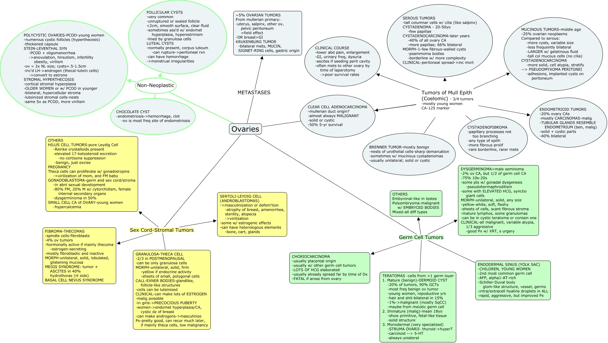 This Concept Map, created with IHMC CmapTools, has information related to: Ovaries, Ovaries Sex Cord-Stromal Tumors SERTOLI-LEYDIG CELL (ANDROBLASTOMAS) ->masculinization or defem'tion -atrophy of breast, amenorrhea, sterility, alopecia ->virilization -some w/ estrogenic effects -can have heterologous elements -bone, cart, glands, Ovaries Tumors of Mull Epith (Coelomic) - 3/4 tumors -mostly young women CA-125 marker ENDOMETRIOID TUMORS -20% ovary CAs -mostly CARCINOMAS-malig -TUBULAR GLANDS RESEMBLE ENDOMETRIUM (ben, malig) -solid + cystic parts -40% bilateral, Ovaries Non-Neoplastic POLYCYSTIC OVARIES-PCOD-young women -numerous cystic follicles (hyperthecosis) -thickened capsule STEIN-LEVENTHAL SYN -PCOD + oligomenorrhea ->anovulation, hirsutism, infertility obesity, virilism -ov = 2x NL size; cysts=.5-1.5cm -inc'd LH->androgen (thecal-lutein cells) ->convert to estrone STROMAL HYPERTHECOSIS -cortical stromal hyperplasia -OLDER WOMEN or w/ PCOD in younger -bilateral, hypercellular stroma -luteinized stromal cells-nests -same Sx as PCOD, more virilism, Ovaries METASTASES ~5% OVARIAN TUMORS From mullerian primary: -uterus, salpinx, other ov, pelvic peritoneum =field effect -OR breast>GI KRUKENBURG TUMOR -bilateral mets, MUCIN, SIGNET-RING cells, gastric origin, Ovaries Germ Cell Tumors DYSGERMINOMA=male seminoma -2% ov CA, but 1/2 of germ cell CA -75% 10s-20s -some pts w/ gonadal dysgenesis -pseudohermaphroditism -some with ELEVATED HCG, synctio giant cells MORPH-unilateral, solid, any size -yellow-white, soft, fleshy -sheets of cells, scant fibrous stroma -mature lymphos, some granulomas -can be in cystic teratoma or contain one CLINICAL-all malignant, variable atypia, 1/3 aggressive -good Px w/ XRT, s urgery, Ovaries Tumors of Mull Epith (Coelomic) - 3/4 tumors -mostly young women CA-125 marker CLINICAL COURSE -lower abd pain, enlargement -GI, urinary freq, dysuria -ascites if seeding perit cavity -often mets to other ovary by time of laparotomy ->poor survival rates, Ovaries Germ Cell Tumors TERATOMAS -cells from ɭ germ layer 1. Mature (benign)-DERMOID CYST -20% of tumors, 90% GCTs -most freq benign ov tumor -young women, repoductive yrs -hair and shit-bilateral in 15% -1%->malignant (mostly SqCC) -maybe from meiotic germ cell 2. Immature (malig)-mean 18yo -show primitive, fetal-like tissue -solid structure 3. Monodermal (very specialized) -STRUMA OVARII- thyroid->hyperT -carcinoid --> 5-HT -always uniateral, Ovaries Tumors of Mull Epith (Coelomic) - 3/4 tumors -mostly young women CA-125 marker CYSTADENOFIBROMA -papillary processes not too branching -any type of epith -more fibrous prolif -rare borderline, rarer mets, Ovaries Sex Cord-Stromal Tumors OTHERS HILUS CELL TUMORS-pure Leydig Cell -Reinke crystalloids present -elevated 17-ketosteroid excretion -no cortisone suppression -benign, just excise PREGNANCY Theca cells can proliferate w/ gonadotropins ->virilization of mom, and FM baby GONADOBLASTOMA-germ and sex cord/stroma -in abnl sexual development -80% FM, 20% M w/ cytorchidism, female internal secondary organs -dysgerminoma in 50% SMALL CELL CA of OVARY-young women -hypercalcemia, Ovaries Germ Cell Tumors CHORIOCARCINOMA -usually placental origin -usually w/ other germ cell tumors -LOTS OF HCG elaborated -usually already spread far by time of Dx -FATAL if arose from ovary, Ovaries Non-Neoplastic FOLLICULAR CYSTS -very common -unruptured or sealed follicle ɚcm, smooth surface, clear fluid -sometimes ass'd w/ endomet hyperplasia, hyperestrinism -lined by granulosa cells LUTEAL CYSTS -normally present, corpus luteum -can rupture->peritoneal rxn -can have hemorrhage ->menstrual irregularities, Ovaries Tumors of Mull Epith (Coelomic) - 3/4 tumors -mostly young women CA-125 marker CLEAR CELL ADENOCARCINOMA -mullerian duct origin? -almost always MALIGNANT -solid or cystic -50% 5-yr survival, Ovaries Germ Cell Tumors OTHERS Embyronal-like in testes Polyembryoma-malignant w/ EMBRYOID BODIES Mixed-all diff types, Ovaries Germ Cell Tumors ENDODERMAL SINUS (YOLK SAC) -CHILDREN, YOUNG WOMEN -2nd most common germ cell -AFP, alpha1-AT-rich -Schiller-Duval body glom-like structure, vessel, germs -intra/extracell hyaline droplets in ALL -rapid, aggressive, but improved Px, Ovaries Sex Cord-Stromal Tumors GRANULOSA-THECA CELL -2/3 in POSTMENOPAUSAL -can be only granulosa cells MORPH-unilateral, solid, firm -yellow if endocrine activity -sheets of small, polygonal cells CALL-EXNER BODIES-glandlike, follicle-like structures -cells can be luteinized CLINICAL-can make lots of ESTROGEN -malig possible -in girls->PRECOCIOUS PUBERTY -women->endomet hyperplasia/CA, cystic dz of breast -can make androgens->masculinize Px-pretty good, can recur much later, if mainly theca cells, low malignancy, Ovaries Tumors of Mull Epith (Coelomic) - 3/4 tumors -mostly young women CA-125 marker MUCINOUS TUMORS-middle age -25% ovarian neoplasms Compared to serous: -more cysts, variable size -less frequently bilateral -LARGER w/ gelatinous fluid -tall col mucous cells (no cilia) CYSTADENOCARCINOMA -more solid, cell atypia, stratify --> PSEUDOMYXOMA PERITONEI -adhesions, implanted cysts on peritoneum, Ovaries Tumors of Mull Epith (Coelomic) - 3/4 tumors -mostly young women CA-125 marker SEROUS TUMORS -tall columnar cells w/ cilia (like salpinx) CYSTADENOMA - 20-50yo -few papillae CYSTADENOCARCINOMA-later years -40% of all ovary CA -more papillae; 66% bilateral MORPH-1-few fibrous-walled cysts -psammoma bodies -borderline w/ more complexity CLINICAL-peritoneal spread->inc mort, Ovaries Sex Cord-Stromal Tumors FIBROMA-THECOMAS -spindle cells-fibroblasts -4% ov tumors -hormonally active if mainly thecoma -estrogen-secreting -mostly fibroblastic and inactive MORPH-unilateral, solid, lobulated, glistening mucosa MEIGS SYNDROME: tumor + ASCITES in 40% hydrothorax (rt side) BASAL CELL NEVUS SYNDROME, Ovaries Tumors of Mull Epith (Coelomic) - 3/4 tumors -mostly young women CA-125 marker BRENNER TUMOR-mostly benign -nests of urot