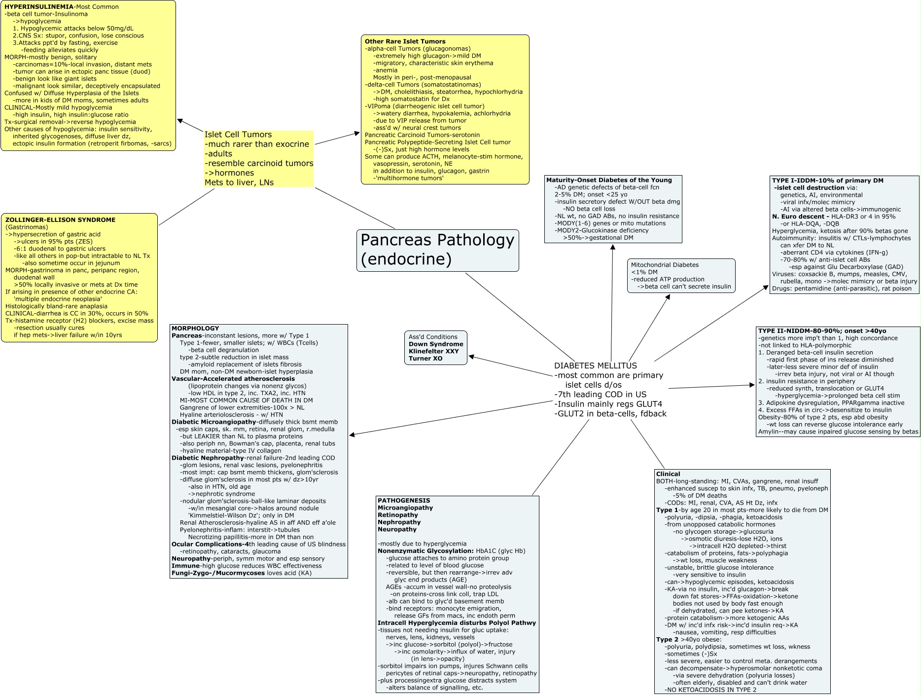 This Concept Map, created with IHMC CmapTools, has information related to: Endocrine Pancreas, Pancreas Pathology (endocrine) DIABETES MELLITUS -most common are primary islet cells d/os -7th leading COD in US -Insulin mainly regs GLUT4 -GLUT2 in beta-cells, fdback Ass'd Conditions Down Syndrome Klinefelter XXY Turner XO, Pancreas Pathology (endocrine) Islet Cell Tumors -much rarer than exocrine -adults -resemble carcinoid tumors ->hormones Mets to liver, LNs Other Rare Islet Tumors -alpha-cell Tumors (glucagonomas) -extremely high glucagon->mild DM -migratory, characteristic skin erythema -anemia Mostly in peri-, post-menopausal -delta-cell Tumors (somatostatinomas) ->DM, cholelithiasis, steatorrhea, hypochlorhydria -high somatostatin for Dx -VIPoma (diarrheogenic islet cell tumor) ->watery diarrhea, hypokalemia, achlorhydria -due to VIP release from tumor -ass'd w/ neural crest tumors Pancreatic Carcinoid Tumors-serotonin Pancreatic Polypeptide-Secreting Islet Cell tumor -(-)Sx, just high hormone levels Some can produce ACTH, melanocyte-stim hormone, vasopressin, serotonin, NE in addition to insulin, glucagon, gastrin -'multihormone tumors', Pancreas Pathology (endocrine) Islet Cell Tumors -much rarer than exocrine -adults -resemble carcinoid tumors ->hormones Mets to liver, LNs HYPERINSULINEMIA-Most Common -beta cell tumor-Insulinoma ->hypoglycemia 1. Hypoglycemic attacks below 50mg/dL 2.CNS Sx: stupor, confusion, lose conscious 3.Attacks ppt'd by fasting, exercise -feeding alleviates quickly MORPH-mostly benign, solitary -carcinomas=10%-local invasion, distant mets -tumor can arise in ectopic panc tissue (duod) -benign look like giant islets -malignant look similar, deceptively encapsulated Confused w/ Diffuse Hyperplasia of the Islets -more in kids of DM moms, sometimes adults CLINICAL-Mostly mild hypoglycemia -high insulin, high insulin:glucose ratio Tx-surgical removal->reverse hypoglycemia Other causes of hypoglycemia: insulin sensitivity, inherited glycogenoses, diffuse liver dz, ectopic insulin formation (retroperit firbomas, -sarcs), Pancreas Pathology (endocrine) DIABETES MELLITUS -most common are primary islet cells d/os -7th leading COD in US -Insulin mainly regs GLUT4 -GLUT2 in beta-cells, fdback PATHOGENESIS Microangiopathy Retinopathy Nephropathy Neuropathy -mostly due to hyperglycemia Nonenzymatic Glycosylation: HbA1C (glyc Hb) -glucose attaches to amino protein group -related to level of blood glucose -reversible, but then rearrange->irrev adv glyc end products (AGE) AGEs -accum in vessel wall-no proteolysis -on proteins-cross link coll, trap LDL -alb can bind to glyc'd basement memb -bind receptors: monocyte emigration, release GFs from macs, inc endoth perm Intracell Hyperglycemia disturbs Polyol Pathwy -tissues not needing insulin for gluc uptake: nerves, lens, kidneys, vessels ->inc glucose->sorbitol (polyol)->fructose ->inc osmolarity->influx of water, injury (in lens->opacity) -sorbitol impairs ion pumps, injures Schwann cells pericytes of retinal caps->neuropathy, retinopathy -plus processingextra glucose distracts system -alters balance of signalling, etc., Pancreas Pathology (endocrine) DIABETES MELLITUS -most common are primary islet cells d/os -7th leading COD in US -Insulin mainly regs GLUT4 -GLUT2 in beta-cells, fdback TYPE I-IDDM-10% of primary DM -islet cell destruction via: genetics, AI, environmental -viral infx/molec mimicry -AI via altered beta cells->immunogenic N. Euro descent - HLA-DR3 or 4 in 95% -or HLA-DQA, -DQB Hyperglycemia, ketosis after 90% betas gone Autoimmunity: insulitis w/ CTLs-lymphochytes can xfer DM to NL -aberrant CD4 via cytokines (IFN-g) -70-80% w/ anti-islet cell ABs -esp against Glu Decarboxylase (GAD) Viruses: coxsackie B, mumps, measles, CMV, rubella, mono ->molec mimicry or beta injury Drugs: pentamidine (anti-parasitic), rat poison, Pancreas Pathology (endocrine) DIABETES MELLITUS -most common are primary islet cells d/os -7th leading COD in US -Insulin mainly regs GLUT4 -GLUT2 in beta-cells, fdback Clinical BOTH-long-standing: MI, CVAs, gangrene, renal insuff -enhanced suscep to skin infx, TB, pneumo, pyeloneph -5% of DM deaths -CODs: MI, renal, CVA, AS Ht Dz, infx Type 1-by age 20 in most pts-more likely to die from DM -polyuria, -dipsia, -phagia, ketoacidosis -from unopposed catabolic hormones -no glycogen storage->glucosuria ->osmotic diuresis-lose H2O, ions ->intracell H2O depleted->thirst -catabolism of proteins, fats->polyphagia ->wt loss, muscle weakness -unstable, brittle glucose intolerance -very sensitive to insulin -can->hypoglycemic episodes, ketoacidosis -KA-via no insulin, inc'd glucagon->break down fat stores->FFAs-oxidation->ketone bodies not used by body fast enough -if dehydrated, can pee ketones->KA -protein catabolism->more ketogenic AAs -DM w/ inc'd infx risk->inc'd insulin req->KA -nausea, vomiting, resp difficulties Type 2 ᡠyo obese: -polyuria, polydipsia, sometimes wt loss, wkness -sometimes (-)Sx -less severe, easier to control meta. derangements -can decompensate->hyperosmolar nonketotic coma -via severe dehydration (polyuria losses) -often elderly, disabled and can't drink water -NO KETOACIDOSIS IN TYPE 2, Pancreas Pathology (endocrine) DIABETES MELLITUS -most common are primary islet cells d/os -7th leading COD in US -Insulin mainly regs GLUT4 -GLUT2 in beta-cells, fdback TYPE II-NIDDM-80-90%; onset ᡠyo -genetics more imp't than 1, high concordance -not linked to HLA-polymorphic 1. Deranged beta-cell insulin secretion -rapid first phase of ins release diminished -later-less severe minor def of insulin -irrev beta injury, not viral or AI though 2. insulin resistance in periphery -reduced synth, translocation or GLUT4 -hyperglycemia->prolonged beta cell stim 3. Adipokine dysregulation, PPARgamma inactive 4. Excess FFAs in circ->desensitize to insulin Obesity-80% of type 2 pts, esp abd obesity -wt loss can reverse glucose intolerance early Amylin--may cause inpaired glucose sensing by betas, Pan
