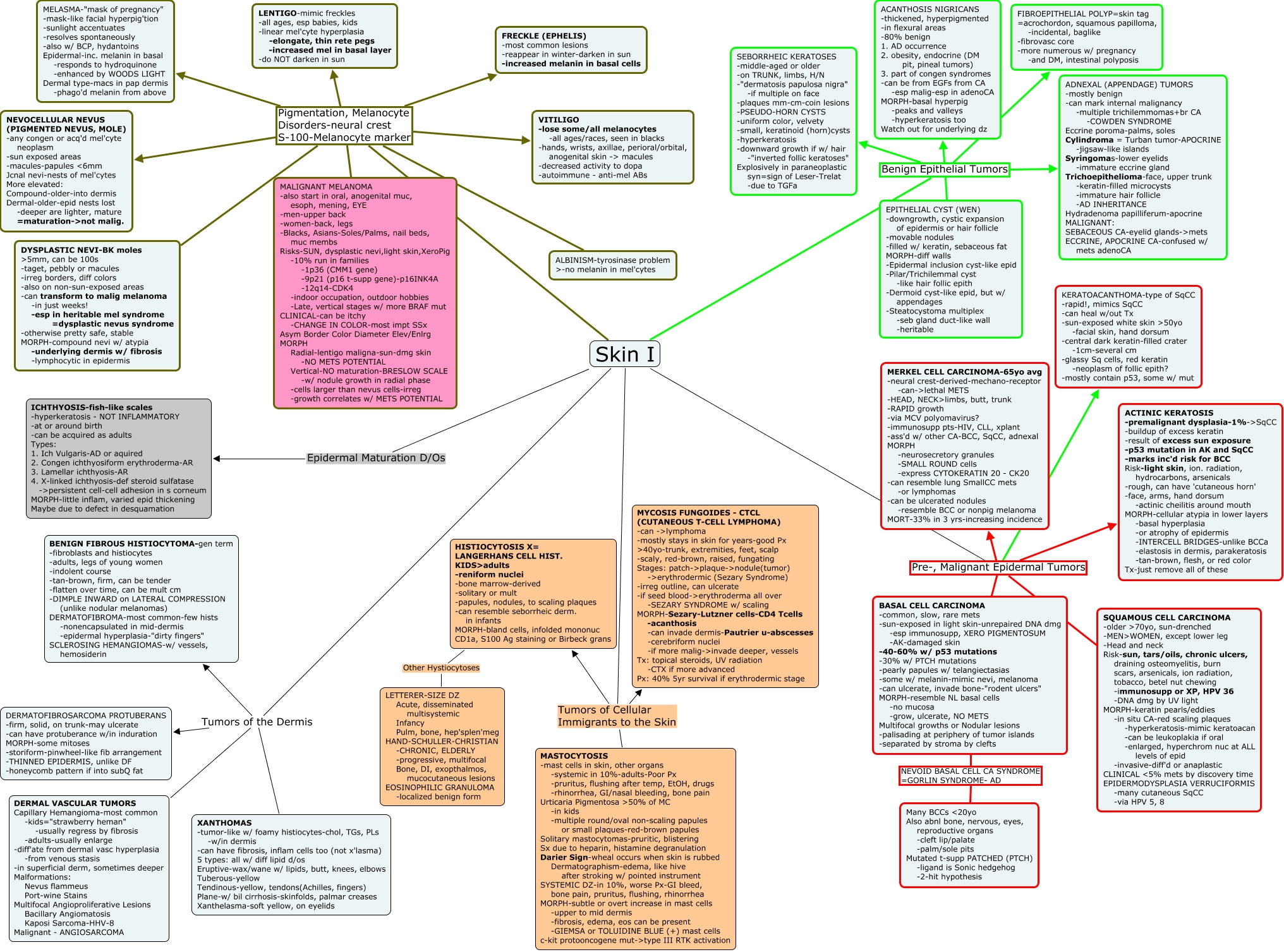 This Concept Map, created with IHMC CmapTools, has information related to: Skin I, Skin I Pre-, Malignant Epidermal Tumors ACTINIC KERATOSIS -premalignant dysplasia-1%->SqCC -buildup of excess keratin -result of excess sun exposure -p53 mutation in AK and SqCC -marks inc'd risk for BCC Risk-light skin, ion. radiation, hydrocarbons, arsenicals -rough, can have 'cutaneous horn' -face, arms, hand dorsum -actinic cheilitis around mouth MORPH-cellular atypia in lower layers -basal hyperplasia -or atrophy of epidermis -INTERCELL BRIDGES-unlike BCCa -elastosis in dermis, parakeratosis -tan-brown, flesh, or red color Tx-just remove all of these, Skin I Benign Epithelial Tumors ADNEXAL (APPENDAGE) TUMORS -mostly benign -can mark internal malignancy -multiple trichilemmomas+br CA -COWDEN SYNDROME Eccrine poroma-palms, soles Cylindroma = Turban tumor-APOCRINE -jigsaw-like islands Syringomas-lower eyelids -immature eccrine gland Trichoepithelioma-face, upper trunk -keratin-filled microcysts -immature hair follicle -AD INHERITANCE Hydradenoma papilliferum-apocrine MALIGNANT: SEBACEOUS CA-eyelid glands->mets ECCRINE, APOCRINE CA-confused w/ mets adenoCA, Skin I Tumors of the Dermis DERMATOFIBROSARCOMA PROTUBERANS -firm, solid, on trunk-may ulcerate -can have protuberance w/in induration MORPH-some mitoses -storiform-pinwheel-like fib arrangement -THINNED EPIDERMIS, unlike DF -honeycomb pattern if into subQ fat, Skin I Tumors of Cellular Immigrants to the Skin MASTOCYTOSIS -mast cells in skin, other organs -systemic in 10%-adults-Poor Px -pruritus, flushing after temp, EtOH, drugs -rhinorrhea, GI/nasal bleeding, bone pain Urticaria Pigmentosa ᡪ% of MC -in kids -multiple round/oval non-scaling papules or small plaques-red-brown papules Solitary mastocytomas-pruritic, blistering Sx due to heparin, histamine degranulation Darier Sign-wheal occurs when skin is rubbed Dermatographism-edema, like hive after stroking w/ pointed instrument SYSTEMIC DZ-in 10%, worse Px-GI bleed, bone pain, pruritus, flushing, rhinorrhea MORPH-subtle or overt increase in mast cells -upper to mid dermis -fibrosis, edema, eos can be present -GIEMSA or TOLUIDINE BLUE (+) mast cells c-kit protooncogene mut->type III RTK activation, Skin I Tumors of the Dermis DERMAL VASCULAR TUMORS Capillary Hemangioma-most common -kids="strawberry heman" -usually regress by fibrosis -adults-usually enlarge -diff'ate from dermal vasc hyperplasia -from venous stasis -in superficial derm, sometimes deeper Malformations: Nevus flammeus Port-wine Stains Multifocal Angioproliferative Lesions Bacillary Angiomatosis Kaposi Sarcoma-HHV-8 Malignant - ANGIOSARCOMA, Skin I Tumors of Cellular Immigrants to the Skin MYCOSIS FUNGOIDES - CTCL (CUTANEOUS T-CELL LYMPHOMA) -can ->lymphoma -mostly stays in skin for years-good Px ᡠyo-trunk, extremities, feet, scalp -scaly, red-brown, raised, fungating Stages: patch->plaque->nodule(tumor) ->erythrodermic (Sezary Syndrome) -irreg outline, can ulcerate -if seed blood->erythroderma all over -SEZARY SYNDROME w/ scaling MORPH-Sezary-Lutzner cells-CD4 Tcells -acanthosis -can invade dermis-Pautrier u-abscesses -cerebriform nuclei -if more malig->invade deeper, vessels Tx: topical steroids, UV radiation -CTX if more advanced Px: 40% 5yr survival if erythrodermic stage, Skin I Pigmentation, Melanocyte Disorders-neural crest S-100-Melanocyte marker NEVOCELLULAR NEVUS (PIGMENTED NEVUS, MOLE) -any congen or acq'd mel'cyte neoplasm -sun exposed areas -macules-papules ɞmm Jcnal nevi-nests of mel'cytes More elevated: Compound-older-into dermis Dermal-older-epid nests lost -deeper are lighter, mature =maturation->not malig., HISTIOCYTOSIS X= LANGERHANS CELL HIST. KIDS>adults -reniform nuclei -bone marrow-derived -solitary or mult -papules, nodules, to scaling plaques -can resemble seborrheic derm. in infants MORPH-bland cells, infolded mononuc CD1a, S100 Ag staining or Birbeck grans Other Hystiocytoses LETTERER-SIZE DZ Acute, disseminated multisystemic Infancy Pulm, bone, hep'splen'meg HAND-SCHULLER-CHRISTIAN -CHRONIC, ELDERLY -progressive, multifocal Bone, DI, exopthalmos, mucocutaneous lesions EOSINOPHILIC GRANULOMA -localized benign form, Skin I Pigmentation, Melanocyte Disorders-neural crest S-100-Melanocyte marker MALIGNANT MELANOMA -also start in oral, anogenital muc, esoph, mening, EYE -men-upper back -women-back, legs -Blacks, Asians-Soles/Palms, nail beds, muc membs Risks-SUN, dysplastic nevi,light skin,XeroPig -10% run in families -1p36 (CMM1 gene) -9p21 (p16 t-supp gene)-p16INK4A -12q14-CDK4 -indoor occupation, outdoor hobbies -Late, vertical stages w/ more BRAF mut CLINICAL-can be itchy -CHANGE IN COLOR-most impt SSx Asym Border Color Diameter Elev/Enlrg MORPH Radial-lentigo maligna-sun-dmg skin -NO METS POTENTIAL Vertical-NO maturation-BRESLOW SCALE -w/ nodule growth in radial phase -cells larger than nevus cells-irreg -growth correlates w/ METS POTENTIAL, Skin I Benign Epithelial Tumors EPITHELIAL CYST (WEN) -downgrowth, cystic expansion of epidermis or hair follicle -movable nodules -filled w/ keratin, sebaceous fat MORPH-diff walls -Epidermal inclusion cyst-like epid -Pilar/Trichilemmal cyst -like hair follic epith -Dermoid cyst-like epid, but w/ appendages -Steatocystoma multiplex -seb gland duct-like wall -heritable, Skin I Epidermal Maturation D/Os ICHTHYOSIS-fish-like scales -hyperkeratosis - NOT INFLAMMATORY -at or around birth -can be acquired as adults Types: 1. Ich Vulgaris-AD or aquired 2. Congen ichthyosiform erythroderma-AR 3. Lamellar ichthyosis-AR 4. X-linked ichthyosis-def steroid sulfatase ->persistent cell-cell adhesion in s corneum MORPH-little inflam, varied epid thickening Maybe due to defect in desquamation, BASAL CELL CARCINOMA -common, slow, rare mets -sun-exposed in light skin-unrepaired DNA dmg -esp immunosupp, XERO PIGMENTOSUM -AK-damaged skin -40-60% w/ p53 mutations -30% w/ PTCH mutations -pearly papules w/ telangiectasias -some w/ melanin-mimic nevi, melanoma -can ulcerate, invade bone-"