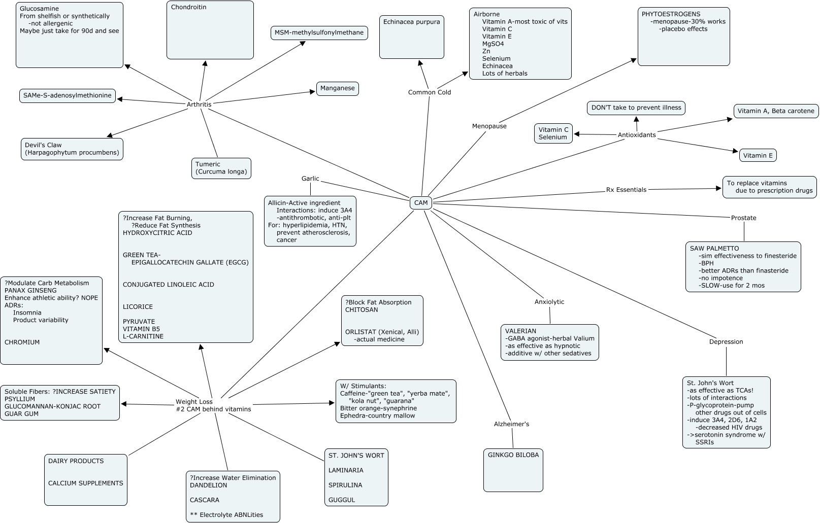 This Concept Map, created with IHMC CmapTools, has information related to: CAM, CAM Menopause PHYTOESTROGENS -menopause-30% works -placebo effects, CAM Antioxidants DON'T take to prevent illness, CAM Arthritis Chondroitin, CAM Depression St. John's Wort -as effective as TCAs! -lots of interactions -P-glycoprotein-pump other drugs out of cells -induce 3A4, 2D6, 1A2 -decreased HIV drugs ->serotonin syndrome w/ SSRIs, CAM Weight Loss #2 CAM behind vitamins ST. JOHN'S WORT LAMINARIA SPIRULINA GUGGUL, CAM Weight Loss #2 CAM behind vitamins DAIRY PRODUCTS CALCIUM SUPPLEMENTS, CAM Arthritis MSM-methylsulfonylmethane, CAM Arthritis Manganese, CAM Antioxidants Vitamin C Selenium, CAM Antioxidants Vitamin A, Beta carotene, CAM Arthritis Tumeric (Curcuma longa), CAM Common Cold Airborne Vitamin A-most toxic of vits Vitamin C Vitamin E MgSO4 Zn Selenium Echinacea Lots of herbals, CAM Rx Essentials To replace vitamins due to prescription drugs, CAM Anxiolytic VALERIAN -GABA agonist-herbal Valium -as effective as hypnotic -additive w/ other sedatives, CAM Antioxidants Vitamin E, CAM Weight Loss #2 CAM behind vitamins W/ Stimulants: Caffeine-"green tea", "yerba mate", "kola nut", "guarana" Bitter orange-synephrine Ephedra-country mallow, CAM Common Cold Echinacea purpura, CAM Garlic Allicin-Active ingredient Interactions: induce 3A4 -antithrombotic, anti-plt For: hyperlipidemia, HTN, prevent atherosclerosis, cancer, CAM Weight Loss #2 CAM behind vitamins ?Block Fat Absorption CHITOSAN ORLISTAT (Xenical, Alli) -actual medicine, CAM Arthritis Devil's Claw (Harpagophytum procumbens)