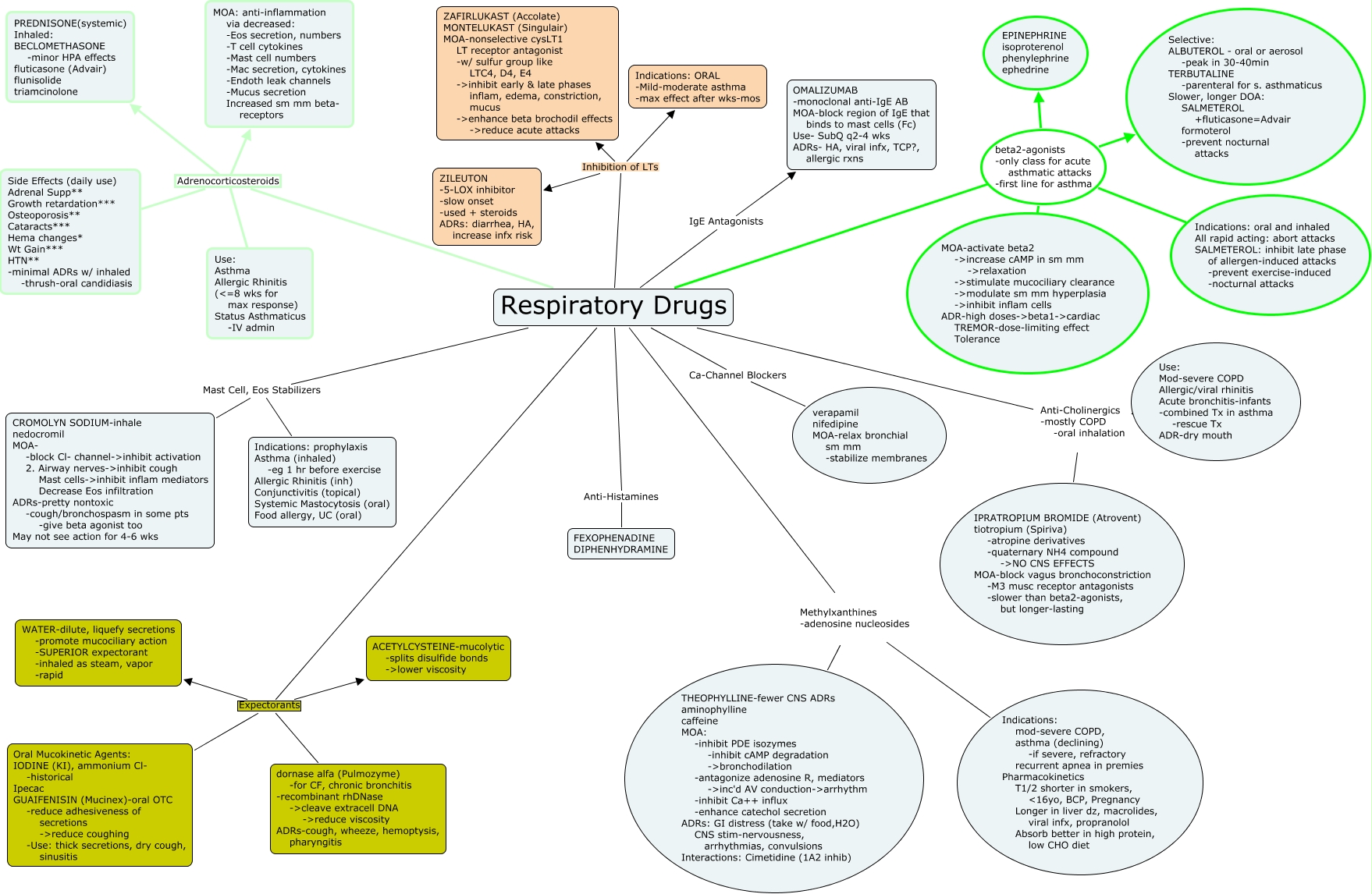 This Concept Map, created with IHMC CmapTools, has information related to: Respiratory Drugs, Respiratory Drugs beta2-agonists -only class for acute asthmatic attacks -first line for asthma Indications: oral and inhaled All rapid acting: abort attacks SALMETEROL: inhibit late phase of allergen-induced attacks -prevent exercise-induced -nocturnal attacks, Respiratory Drugs Expectorants ACETYLCYSTEINE-mucolytic -splits disulfide bonds ->lower viscosity, Respiratory Drugs IgE Antagonists OMALIZUMAB -monoclonal anti-IgE AB MOA-block region of IgE that binds to mast cells (Fc) Use- SubQ q2-4 wks ADRs- HA, viral infx, TCP?, allergic rxns, Respiratory Drugs beta2-agonists -only class for acute asthmatic attacks -first line for asthma Selective: ALBUTEROL - oral or aerosol -peak in 30-40min TERBUTALINE -parenteral for s. asthmaticus Slower, longer DOA: SALMETEROL +fluticasone=Advair formoterol -prevent nocturnal attacks, Respiratory Drugs beta2-agonists -only class for acute asthmatic attacks -first line for asthma EPINEPHRINE isoproterenol phenylephrine ephedrine, Respiratory Drugs Adrenocorticosteroids MOA: anti-inflammation via decreased: -Eos secretion, numbers -T cell cytokines -Mast cell numbers -Mac secretion, cytokines -Endoth leak channels -Mucus secretion Increased sm mm beta- receptors, Respiratory Drugs Adrenocorticosteroids Side Effects (daily use) Adrenal Supp** Growth retardation*** Osteoporosis** Cataracts*** Hema changes* Wt Gain*** HTN** -minimal ADRs w/ inhaled -thrush-oral candidiasis, Respiratory Drugs Anti-Histamines FEXOPHENADINE DIPHENHYDRAMINE, Respiratory Drugs Adrenocorticosteroids PREDNISONE(systemic) Inhaled: BECLOMETHASONE -minor HPA effects fluticasone (Advair) flunisolide triamcinolone, Respiratory Drugs Mast Cell, Eos Stabilizers CROMOLYN SODIUM-inhale nedocromil MOA- -block Cl- channel->inhibit activation 2. Airway nerves->inhibit cough Mast cells->inhibit inflam mediators Decrease Eos infiltration ADRs-pretty nontoxic -cough/bronchospasm in some pts -give beta agonist too May not see action for 4-6 wks, Respiratory Drugs Mast Cell, Eos Stabilizers Indications: prophylaxis Asthma (inhaled) -eg 1 hr before exercise Allergic Rhinitis (inh) Conjunctivitis (topical) Systemic Mastocytosis (oral) Food allergy, UC (oral), Respiratory Drugs Expectorants Oral Mucokinetic Agents: IODINE (KI), ammonium Cl- -historical Ipecac GUAIFENISIN (Mucinex)-oral OTC -reduce adhesiveness of secretions ->reduce coughing -Use: thick secretions, dry cough, sinusitis, Respiratory Drugs Methylxanthines -adenosine nucleosides Indications: mod-severe COPD, asthma (declining) -if severe, refractory recurrent apnea in premies Pharmacokinetics T1/2 shorter in smokers, កyo, BCP, Pregnancy Longer in liver dz, macrolides, viral infx, propranolol Absorb better in high protein, low CHO diet, Respiratory Drugs Adrenocorticosteroids Use: Asthma Allergic Rhinitis (<=8 wks for max response) Status Asthmaticus -IV admin, Respiratory Drugs Methylxanthines -adenosine nucleosides THEOPHYLLINE-fewer CNS ADRs aminophylline caffeine MOA: -inhibit PDE isozymes -inhibit cAMP degradation ->bronchodilation -antagonize adenosine R, mediators ->inc'd AV conduction->arrhythm -inhibit Ca++ influx -enhance catechol secretion ADRs: GI distress (take w/ food,H2O) CNS stim-nervousness, arrhythmias, convulsions Interactions: Cimetidine (1A2 inhib), Respiratory Drugs Expectorants dornase alfa (Pulmozyme) -for CF, chronic bronchitis -recombinant rhDNase ->cleave extracell DNA ->reduce viscosity ADRs-cough, wheeze, hemoptysis, pharyngitis, Respiratory Drugs Ca-Channel Blockers verapamil nifedipine MOA-relax bronchial sm mm -stabilize membranes, Respiratory Drugs Anti-Cholinergics -mostly COPD -oral inhalation IPRATROPIUM BROMIDE (Atrovent) tiotropium (Spiriva) -atropine derivatives -quaternary NH4 compound ->NO CNS EFFECTS MOA-block vagus bronchoconstriction -M3 musc receptor antagonists -slower than beta2-agonists, but longer-lasting, Respiratory Drugs Expectorants WATER-dilute, liquefy secretions -promote mucociliary action -SUPERIOR expectorant -inhaled as steam, vapor -rapid, Respiratory Drugs Inhibition of LTs Indications: ORAL -Mild-moderate asthma -max effect after wks-mos