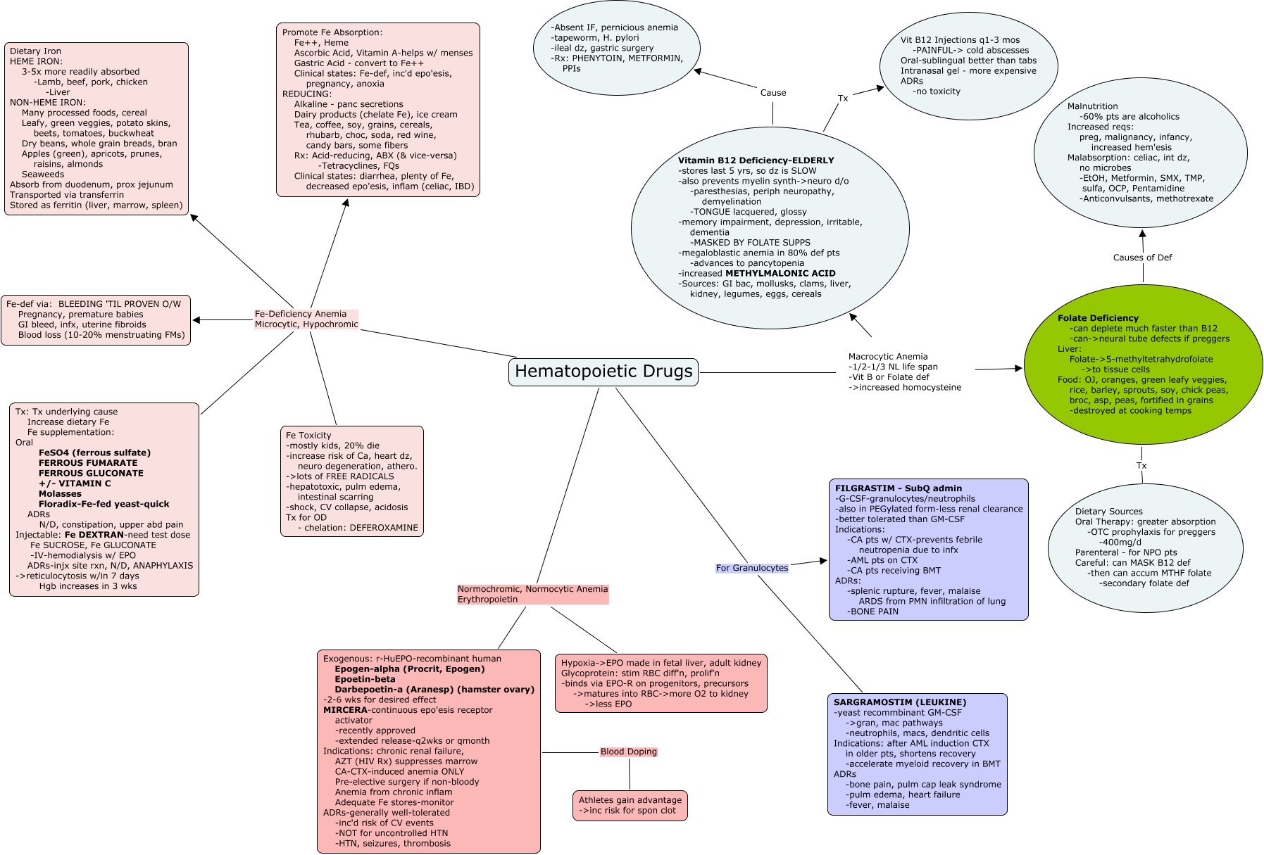 This Concept Map, created with IHMC CmapTools, has information related to: Hematopoietic Drugs, Hematopoietic Drugs Normochromic, Normocytic Anemia Erythropoietin Hypoxia->EPO made in fetal liver, adult kidney Glycoprotein: stim RBC diff'n, prolif'n -binds via EPO-R on progenitors, precursors ->matures into RBC->more O2 to kidney ->less EPO, Hematopoietic Drugs Fe-Deficiency Anemia Microcytic, Hypochromic Fe Toxicity -mostly kids, 20% die -increase risk of Ca, heart dz, neuro degeneration, athero. ->lots of FREE RADICALS -hepatotoxic, pulm edema, intestinal scarring -shock, CV collapse, acidosis Tx for OD - chelation: DEFEROXAMINE, Hematopoietic Drugs Fe-Deficiency Anemia Microcytic, Hypochromic Promote Fe Absorption: Fe++, Heme Ascorbic Acid, Vitamin A-helps w/ menses Gastric Acid - convert to Fe++ Clinical states: Fe-def, inc'd epo'esis, pregnancy, anoxia REDUCING: Alkaline - panc secretions Dairy products (chelate Fe), ice cream Tea, coffee, soy, grains, cereals, rhubarb, choc, soda, red wine, candy bars, some fibers Rx: Acid-reducing, ABX (& vice-versa) -Tetracyclines, FQs Clinical states: diarrhea, plenty of Fe, decreased epo'esis, inflam (celiac, IBD), Exogenous: r-HuEPO-recombinant human Epogen-alpha (Procrit, Epogen) Epoetin-beta Darbepoetin-a (Aranesp) (hamster ovary) -2-6 wks for desired effect MIRCERA-continuous epo'esis receptor activator -recently approved -extended release-q2wks or qmonth Indications: chronic renal failure, AZT (HIV Rx) suppresses marrow CA-CTX-induced anemia ONLY Pre-elective surgery if non-bloody Anemia from chronic inflam Adequate Fe stores-monitor ADRs-generally well-tolerated -inc'd risk of CV events -NOT for uncontrolled HTN -HTN, seizures, thrombosis Blood Doping Athletes gain advantage ->inc risk for spon clot, Hematopoietic Drugs Macrocytic Anemia -1/2-1/3 NL life span -Vit B or Folate def ->increased homocysteine Vitamin B12 Deficiency-ELDERLY -stores last 5 yrs, so dz is SLOW -also prevents myelin synth->neuro d/o -paresthesias, periph neuropathy, demyelination -TONGUE lacquered, glossy -memory impairment, depression, irritable, dementia -MASKED BY FOLATE SUPPS -megaloblastic anemia in 80% def pts -advances to pancytopenia -increased METHYLMALONIC ACID -Sources: GI bac, mollusks, clams, liver, kidney, legumes, eggs, cereals, Hematopoietic Drugs Fe-Deficiency Anemia Microcytic, Hypochromic Tx: Tx underlying cause Increase dietary Fe Fe supplementation: Oral FeSO4 (ferrous sulfate) FERROUS FUMARATE FERROUS GLUCONATE +/- VITAMIN C Molasses Floradix-Fe-fed yeast-quick ADRs N/D, constipation, upper abd pain Injectable: Fe DEXTRAN-need test dose Fe SUCROSE, Fe GLUCONATE -IV-hemodialysis w/ EPO ADRs-injx site rxn, N/D, ANAPHYLAXIS ->reticulocytosis w/in 7 days Hgb increases in 3 wks, Hematopoietic Drugs For Granulocytes FILGRASTIM - SubQ admin -G-CSF-granulocytes/neutrophils -also in PEGylated form-less renal clearance -better tolerated than GM-CSF Indications: -CA pts w/ CTX-prevents febrile neutropenia due to infx -AML pts on CTX -CA pts receiving BMT ADRs: -splenic rupture, fever, malaise ARDS from PMN infiltration of lung -BONE PAIN, Hematopoietic Drugs Fe-Deficiency Anemia Microcytic, Hypochromic Dietary Iron HEME IRON: 3-5x more readily absorbed -Lamb, beef, pork, chicken -Liver NON-HEME IRON: Many processed foods, cereal Leafy, green veggies, potato skins, beets, tomatoes, buckwheat Dry beans, whole grain breads, bran Apples (green), apricots, prunes, raisins, almonds Seaweeds Absorb from duodenum, prox jejunum Transported via transferrin Stored as ferritin (liver, marrow, spleen), Hematopoietic Drugs Macrocytic Anemia -1/2-1/3 NL life span -Vit B or Folate def ->increased homocysteine Folate Deficiency -can deplete much faster than B12 -can->neural tube defects if preggers Liver: Folate-ɱ-methyltetrahydrofolate ->to tissue cells Food: OJ, oranges, green leafy veggies, rice, barley, sprouts, soy, chick peas, broc, asp, peas, fortified in grains -destroyed at cooking temps, Hematopoietic Drugs Normochromic, Normocytic Anemia Erythropoietin Exogenous: r-HuEPO-recombinant human Epogen-alpha (Procrit, Epogen) Epoetin-beta Darbepoetin-a (Aranesp) (hamster ovary) -2-6 wks for desired effect MIRCERA-continuous epo'esis receptor activator -recently approved -extended release-q2wks or qmonth Indications: chronic renal failure, AZT (HIV Rx) suppresses marrow CA-CTX-induced anemia ONLY Pre-elective surgery if non-bloody Anemia from chronic inflam Adequate Fe stores-monitor ADRs-generally well-tolerated -inc'd risk of CV events -NOT for uncontrolled HTN -HTN, seizures, thrombosis, Vitamin B12 Deficiency-ELDERLY -stores last 5 yrs, so dz is SLOW -also prevents myelin synth->neuro d/o -paresthesias, periph neuropathy, demyelination -TONGUE lacquered, glossy -memory impairment, depression, irritable, dementia -MASKED BY FOLATE SUPPS -megaloblastic anemia in 80% def pts -advances to pancytopenia -increased METHYLMALONIC ACID -Sources: GI bac, mollusks, clams, liver, kidney, legumes, eggs, cereals Tx Vit B12 Injections q1-3 mos -PAINFUL-> cold abscesses Oral-sublingual better than tabs Intranasal gel - more expensive ADRs -no toxicity, Vitamin B12 Deficiency-ELDERLY -stores last 5 yrs, so dz is SLOW -also prevents myelin synth->neuro d/o -paresthesias, periph neuropathy, demyelination -TONGUE lacquered, glossy -memory impairment, depression, irritable, dementia -MASKED BY FOLATE SUPPS -megaloblastic anemia in 80% def pts -advances to pancytopenia -increased METHYLMALONIC ACID -Sources: GI bac, mollusks, clams, liver, kidney, legumes, eggs, cereals Cause -Absent IF, pernicious anemia -tapeworm, H. pylori -ileal dz, gastric surgery -Rx: PHENYTOIN, METFORMIN, PPIs, Hematopoietic Drugs For Granulocytes SARGRAMOSTIM (LEUKINE) -yeast recommbinant GM-CSF ->gran, mac pathways -neutrophils, macs, dendritic cells Indications: after AML induction CTX in older pts, shortens recovery -accelerate myeloid recovery in BMT ADRs -bone pain, pulm cap leak syndrome -pulm edema, hea