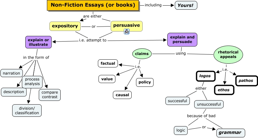 This Concept Map, created with IHMC CmapTools, has information related to: 122overview, expository i.e. attempt to explain or illustrate, logic or grammar, explain or illustrate in the form of compare contrast, rhetorical appeals i.e. logos, claims i.e. factual, logos either unsuccessful, unsuccessful because of bad logic, rhetorical appeals i.e. ethos, claims i.e. policy, explain and persuade using claims, explain or illustrate in the form of process analysis, Non-Fiction Essays (or books) are either expository, rhetorical appeals i.e. pathos, explain and persuade using rhetorical appeals, Non-Fiction Essays (or books) are either persuasive, Non-Fiction Essays (or books) including Yours!, expository or persuasive, explain or illustrate in the form of description, explain or illustrate in the form of division/ classification, logos either successful