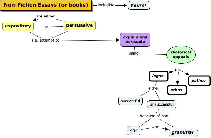 This Concept Map, created with IHMC CmapTools, has information related to: 122appeals, expository i.e. attempt to explain and persuade, expository or persuasive, explain and persuade using rhetorical appeals, rhetorical appeals i.e. ethos, logos either unsuccessful, Non-Fiction Essays (or books) are either persuasive, rhetorical appeals i.e. pathos, Non-Fiction Essays (or books) are either expository, rhetorical appeals i.e. logos, expository i.e. attempt to persuasive, Non-Fiction Essays (or books) including Yours!, logos either successful, logic or grammar, unsuccessful because of bad logic, unsuccessful because of bad grammar