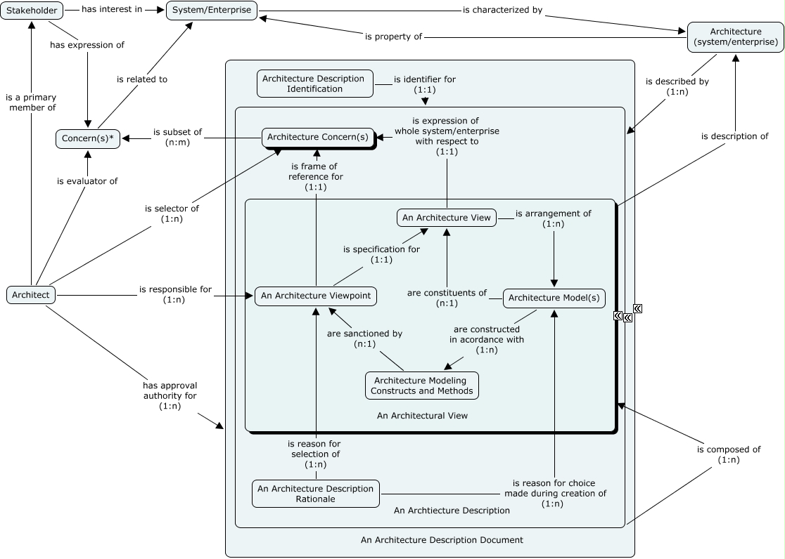 42010 Concepts III, Architecture Modeling Constructs and Methods are sanctioned by (n:1) An Architecture Viewpoint, Architectural View is description of Architecture (system/enterprise), An Architecture Viewpoint is frame of reference for (1:1) Architecture Concern(s), Architect is a primary member of Stakeholder, Architect is evaluator of Concern(s)*, Architecture Description Identification is identifier for (1:1) An Architecture Description, An Architecture Description Rationale is reason for choice made during creation of (1:n) Architecture Model(s), An Architecture View is expression of whole system/enterprise with respect to (1:1) Architecture Concern(s), Stakeholder has expression of Concern(s)*, An Architecture Description Rationale is reason for selection of (1:n) An Architecture Viewpoint