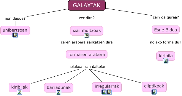 This Concept Map, created with IHMC CmapTools, has information related to: Galaxiak, barradunak nolakoa izan daiteke kiribilak, irregularrak nolakoa izan daiteke kiribilak, formaren arabera nolakoa izan daiteke kiribilak, GALAXIAK non daude? unibertsoan, GALAXIAK zein da gurea? Esne Bidea, GALAXIAK zer dira? izar multzoak, Esne Bidea nolako forma du? kiribila, eliptikoak nolakoa izan daiteke kiribilak, izar multzoak zeren arabera sailkatzen dira formaren arabera