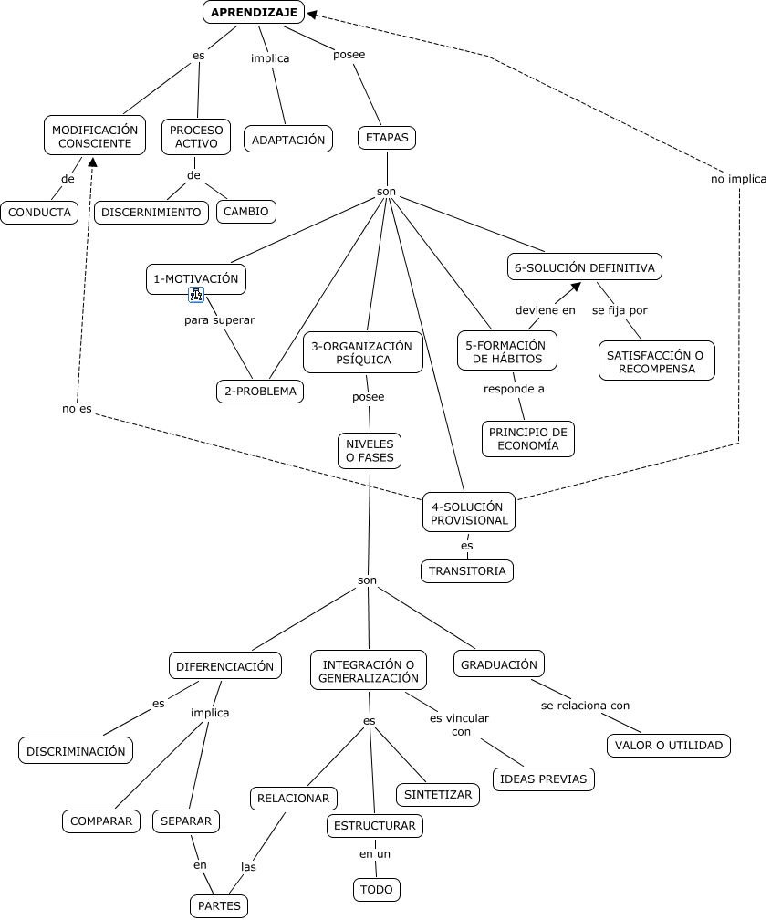 Aprendizaje, ETAPAS son 2-PROBLEMA, APRENDIZAJE es PROCESO ACTIVO, APRENDIZAJE implica ADAPTACIÓN, NIVELES O FASES son INTEGRACIÓN O GENERALIZACIÓN, MODIFICACIÓN CONSCIENTE de CONDUCTA, APRENDIZAJE posee ETAPAS, NIVELES O FASES son GRADUACIÓN, ETAPAS son 6-SOLUCIÓN DEFINITIVA, RELACIONAR las PARTES, 5-FORMACIÓN DE HÁBITOS deviene en 6-SOLUCIÓN DEFINITIVA