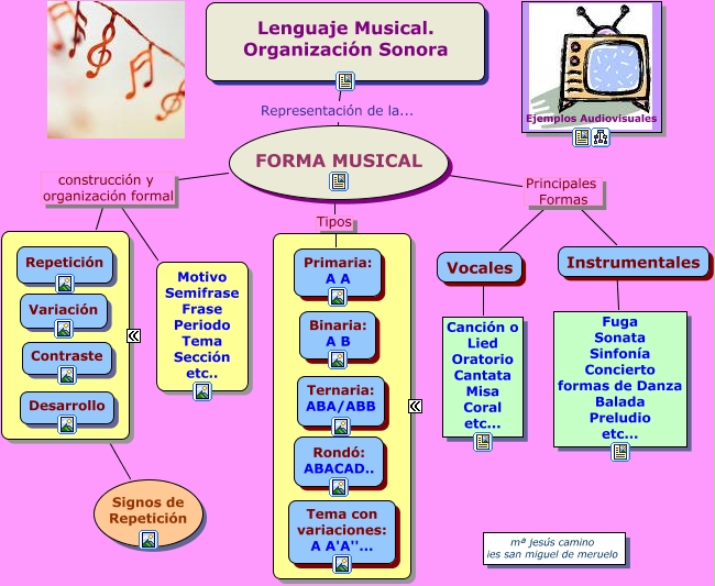 Este mapa conceptual tiene información relacionada a: Forma, FORMA MUSICAL construcción y organización formal ????, Lenguaje Musical. Organización Sonora Representación de la... FORMA MUSICAL, ???? ???? Signos de Repetición, Vocales ???? Canción o Lied Oratorio Cantata Misa Coral etc..., FORMA MUSICAL Principales Formas Instrumentales, FORMA MUSICAL construcción y organización formal Motivo Semifrase Frase Periodo Tema Sección etc.., Instrumentales ???? Fuga Sonata Sinfonía Concierto formas de Danza Balada Preludio etc..., FORMA MUSICAL Tipos Primaria: A A, FORMA MUSICAL Principales Formas Vocales