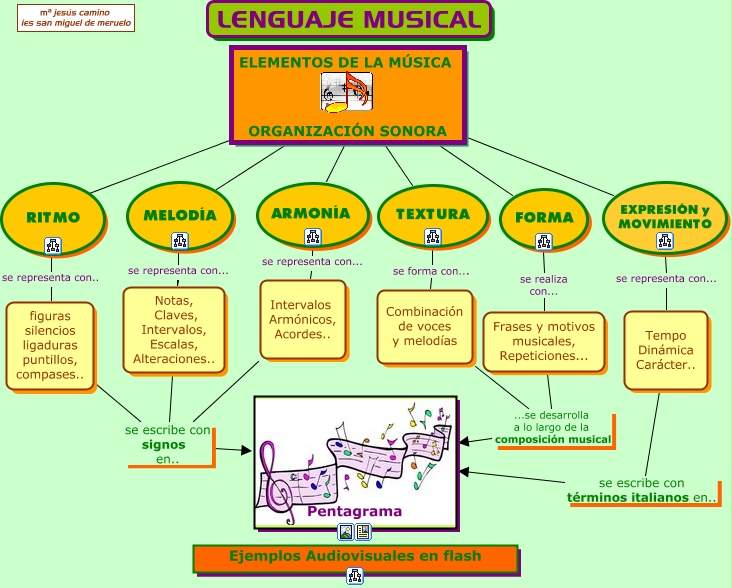 Este mapa conceptual tiene información relacionada a: lenguaje musical, EXPRESIÓN y MOVIMIENTO se representa con... Tempo Dinámica Carácter.., Combinación de voces y melodías ...se desarrolla a lo largo de la composición musical Pentagrama, MELODÍA se representa con... Notas, Claves, Intervalos, Escalas, Alteraciones.., ELEMENTOS DE LA MÚSICA ORGANIZACIÓN SONORA ???? ARMONÍA, Frases y motivos musicales, Repeticiones... ...se desarrolla a lo largo de la composición musical Pentagrama, FORMA se realiza con... Frases y motivos musicales, Repeticiones..., ARMONÍA se representa con... Intervalos Armónicos, Acordes.., ELEMENTOS DE LA MÚSICA ORGANIZACIÓN SONORA ???? EXPRESIÓN y MOVIMIENTO, figuras silencios ligaduras puntillos, compases.. se escribe con signos en.. Pentagrama, Intervalos Armónicos, Acordes.. se escribe con signos en.. Pentagrama, RITMO se representa con.. figuras silencios ligaduras puntillos, compases.., Tempo Dinámica Carácter.. se escribe con términos italianos en.. Pentagrama, ELEMENTOS DE LA MÚSICA ORGANIZACIÓN SONORA ???? FORMA, ELEMENTOS DE LA MÚSICA ORGANIZACIÓN SONORA ???? MELODÍA, ELEMENTOS DE LA MÚSICA ORGANIZACIÓN SONORA ???? RITMO, TEXTURA se forma con... Combinación de voces y melodías, ELEMENTOS DE LA MÚSICA ORGANIZACIÓN SONORA ???? TEXTURA, Notas, Claves, Intervalos, Escalas, Alteraciones.. se escribe con signos en.. Pentagrama