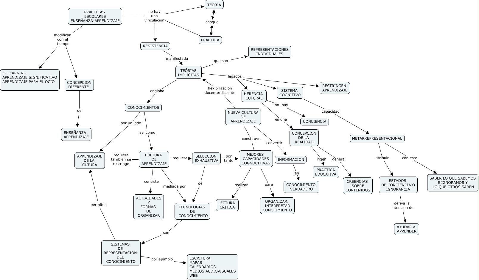 Este Cmap, tiene información relacionada con: PRACTICAS ESCOLARES, HERENCIA CUTURAL es una CONCEPCION DE LA REALIDAD, SISTEMAS DE REPRESENTACION DEL CONOCIMIENTO permiten APRENDIZAJE DE LA CUTURA, CONOCIMIENTOS por un lado APRENDIZAJE DE LA CUTURA, MEJORES CAPACIDADES COGNOCITIVAS para ORGANIZAR, INTERPRETAR CONOCIMIENTO, TEÓRIAS IMPLICITAS que son REPRESENTACIONES INDIVIDUALES, METARREPRESENTACIONAL atribuir ESTADOS DE CONCIENCIA O IGNORANCIA, PRACTICAS ESCOLARES ENSEÑANZA-APRENDIZAJE no hay una vinculacion TEÓRIA, INFORMACION en CONOCIMIENTO VERDADERO, TECNOLOGIAS DE CONOCIMIENTO son SISTEMAS DE REPRESENTACION DEL CONOCIMIENTO, SISTEMAS DE REPRESENTACION DEL CONOCIMIENTO por ejemplo ESCRITURA MAPAS CALENDARIOS MEDIOS AUDIOVISUALES WEB, TEÓRIAS IMPLICITAS legados HERENCIA CUTURAL, METARREPRESENTACIONAL con esto SABER LO QUE SABEMOS E IGNORAMOS Y LO QUE OTROS SABEN, NUEVA CULTURA DE APRENDIZAJE convertir INFORMACION, NUEVA CULTURA DE APRENDIZAJE flexibilizacion docente/discente TEÓRIAS IMPLICITAS, APRENDIZAJE DE LA CUTURA requiere tambien se restringe CULTURA DE APRENDIZAJE, RESISTENCIA manifestada TEÓRIAS IMPLICITAS, PRACTICAS ESCOLARES ENSEÑANZA-APRENDIZAJE no hay una vinculacion PRACTICA, PRACTICAS ESCOLARES ENSEÑANZA-APRENDIZAJE modifican con el tiempo E- LEARNING APRENDIZAJE SIGNIFICATIVO APRENDIZAJE PARA EL OCIO, SELECCION EXHAUSTIVA de TECNOLOGIAS DE CONOCIMIENTO, MEJORES CAPACIDADES COGNOCITIVAS constituye NUEVA CULTURA DE APRENDIZAJE