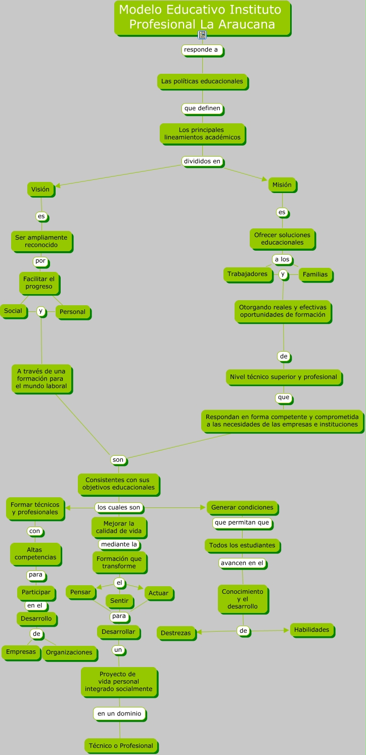 Este Cmap, tiene información relacionada con: Modelo Educativo Instituto Profesional La Araucana, Los principales lineamientos académicos divididos en Misión, Ser ampliamente reconocido por Facilitar el progreso, Desarrollo de Organizaciones, Nivel técnico superior y profesional que Respondan en forma competente y comprometida a las necesidades de las empresas e instituciones, Trabajadores y Otorgando reales y efectivas oportunidades de formación, Misión es Ofrecer soluciones educacionales, Consistentes con sus objetivos educacionales los cuales son Generar condiciones, Sentir para Desarrollar, Todos los estudiantes avancen en el Conocimiento y el desarrollo, Altas competencias para Participar, Otorgando reales y efectivas oportunidades de formación de Nivel técnico superior y profesional, Desarrollar un Proyecto de vida personal integrado socialmente, Formación que transforme el Sentir, Formar técnicos y profesionales con Altas competencias, Personal y A través de una formación para el mundo laboral, Modelo Educativo Instituto Profesional La Araucana responde a Las políticas educacionales, Consistentes con sus objetivos educacionales los cuales son Mejorar la calidad de vida, Generar condiciones que permitan que Todos los estudiantes, Pensar para Desarrollar, Participar en el Desarrollo