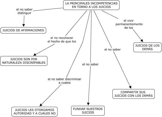 Las principales incompetencias en torno a los juicios, LA PRINCIPALES INCOMPETENCIAS EN TORNO A LOS JUICIOS el vivir permanentemente de los JUICIOS DE LOS DEMÀS, LA PRINCIPALES INCOMPETENCIAS EN TORNO A LOS JUICIOS el no saber discriminar a cuales JUICIOS LES OTORGAMOS AUTORIDAD Y A CUALES NO, LA PRINCIPALES INCOMPETENCIAS EN TORNO A LOS JUICIOS el no saber FUNDAR NUESTROS JUICIOS, LA PRINCIPALES INCOMPETENCIAS EN TORNO A LOS JUICIOS el no saber COMPARTIR SUS JUICIOS CON LOS DEMÁS, LA PRINCIPALES INCOMPETENCIAS EN TORNO A LOS JUICIOS el no reconocer el hecho de que los JUICIOS SON POR NATURALEZA DISCREPABLES, LA PRINCIPALES INCOMPETENCIAS EN TORNO A LOS JUICIOS el no saber distinguir JUICIOS DE AFIRMACIONES