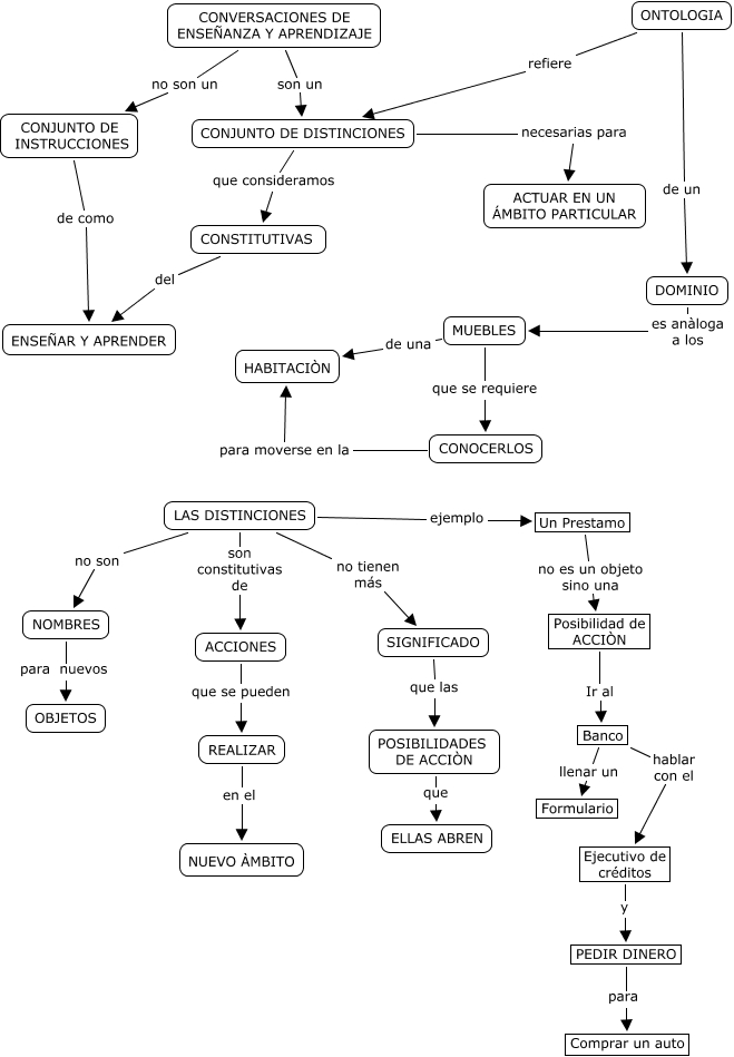 7 conversaciones de enseñanza aprendizaje, MUEBLES de una HABITACIÒN, ONTOLOGIA de un DOMINIO, ONTOLOGIA refiere CONJUNTO DE DISTINCIONES, LAS DISTINCIONES son constitutivas de ACCIONES, CONSTITUTIVAS del ENSEÑAR Y APRENDER, CONOCERLOS para moverse en la HABITACIÒN, DOMINIO es anàloga a los MUEBLES, REALIZAR en el NUEVO ÀMBITO, CONJUNTO DE DISTINCIONES que consideramos CONSTITUTIVAS, PEDIR DINERO para Comprar un auto