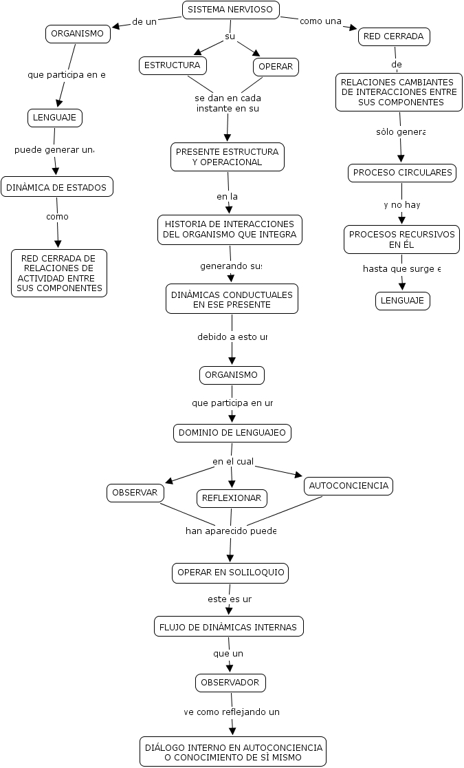 sistema nervioso, di�logo interno en autoconciencia o conocimiento de s� mismo, autoconciencia, historia de interacciones del organismo que integra, observador, red cerrada de relaciones de actividad entre sus componentes, presente estructura y operacional, dominio de lenguajeo, organismo, din�micas conductuales en ese presente, procesos recursivos en �l, lenguaje, din�mica de estados, lenguaje, operar, red cerrada, flujo de din�micas internas, proceso circulares, observar, organismo, estructura, sistema nervioso, relaciones cambiantes de interacciones entre sus componentes, reflexionar, operar en soliloquio