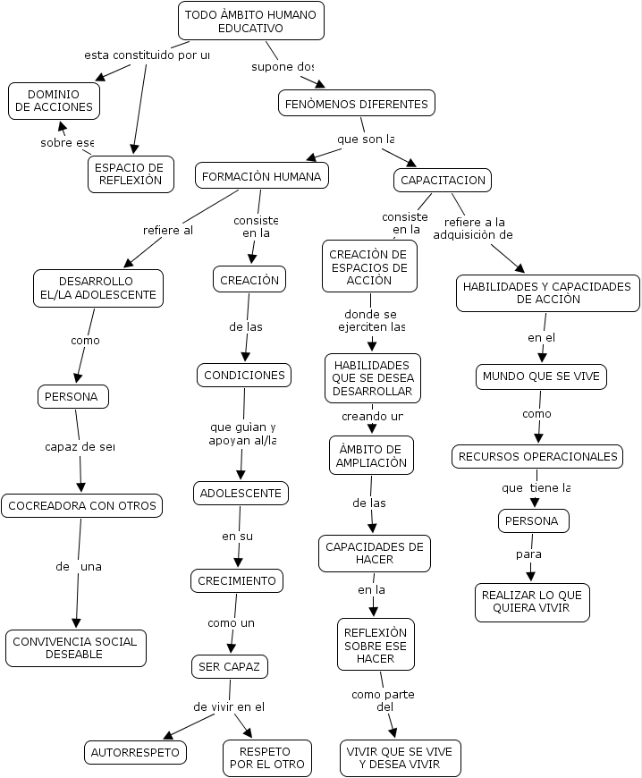 formaci�n humana y capacitacion, creaci�n, habilidades y capacidades de acci�n, capacitacion, persona , condiciones, dominio de acciones, ser capaz, reflexi�n sobre ese hacer, autorrespeto, todo �mbito humano educativo, vivir que se vive y desea vivir, adolescente, mundo que se vive, crecimiento, formaci�n humana, creaci�n de espacios de acci�n, convivencia social deseable , respeto por el otro, desarrollo el la adolescente, �mbito de ampliaci�n, realizar lo que quiera vivir, espacio de reflexi�n, fen�menos diferentes, cocreadora con otros, recursos operacionales, persona , capacidades de hacer, habilidades que se desea desarrollar