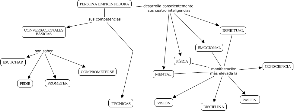 Persona emprendedora, PERSONA EMPRENDEDORA sus competencias `TÉCNICAS, PERSONA EMPRENDEDORA sus competencias CONVERSACIONALES BÁSICAS, CONVERSACIONALES BÁSICAS son saber PROMETER, MENTAL manifestaciòn màs elevada la DISCIPLINA, FÍSICA manifestaciòn màs elevada la CONSCIENCIA, CONVERSACIONALES BÁSICAS son saber COMPROMETERSE, PERSONA EMPRENDEDORA desarrolla conscientemente sus cuatro inteligencias EMOCIONAL, FÍSICA manifestaciòn màs elevada la DISCIPLINA, ESPIRITUAL manifestaciòn màs elevada la PASIÓN, PERSONA EMPRENDEDORA desarrolla conscientemente sus cuatro inteligencias MENTAL