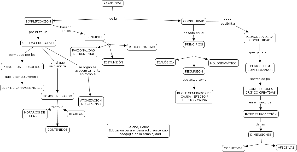 pedagog�a de la complejidad, curriculum complejizador, sistema educativo, principios filos�ficos, paradigma, afectivas, contenidos, hologram�tico, cognitivas, concepciones critico creativas, racionalidad instrumental, dimensiones, atomizaci�n disciplinar, identidad fragmentada, homogeneizando, principios, bucle generador de causa - efecto efecto - causa, recreos, simplificaci�n, recursi�n, galano, carlos educaci�n para el desarrollo sustentable pedagog�a de la complejidad, reduccionismo, complejidad, disyunsi�n, pedagog�a de la complejidad, dial�gico, inter retroacci�n, horarios de clases, principios