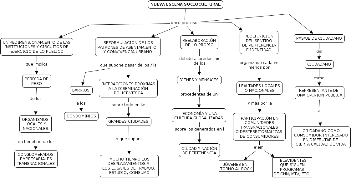 nuevas escenas socioculturales, ciudadano como comsumidor interesado en disfrutar de cierta calidad de vida, lealtades locales o nacionales, reformulaci�n de los patrones de asentamiento y convivencia urbano, un redimensionamiento de las instituciones y circuitos de ejercicio de lo p�blico, ciudadano, mucho tiempo los desplazamientos a los lugares de trabajo, estudio, consumo, econom�a y una cultura globalizadas, condominios, pasaje de ciudadano, conglomerados empresariales transnacionales, perdida de peso, interacciones pr�ximas a la diseminaci�n policentrica, barrios, televidentes que siguen programas de cnn, mtv, etc., nueva escena sociocultural, redefinici�n del sentido de pertenencia e identidad, organismos locales y nacionales, participaci�n en comunidades transnacionales o desterritorializas de consumidores, ciudad y naci�n de pertenencia, j�venes en torno al rock, grandes ciudades, reelaboraci�n del o propio, bienes y mensajes, representante de una opini�n p�blica
