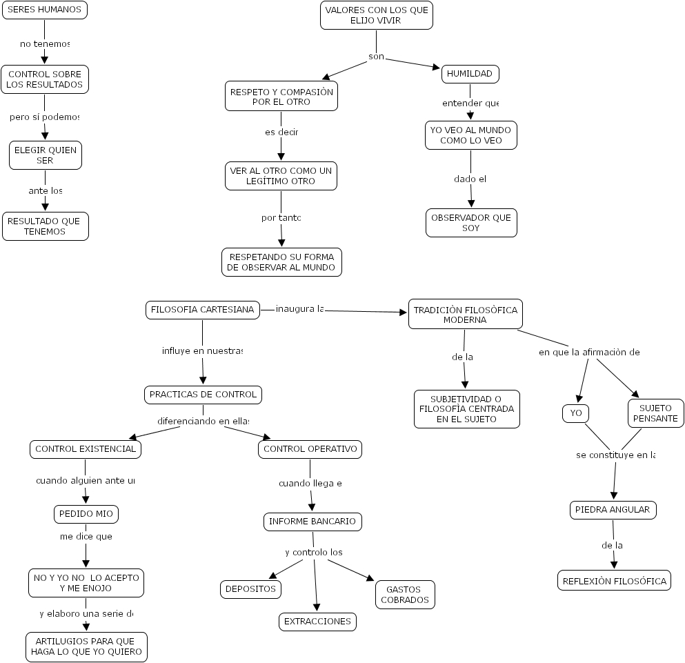 1 control, poder y responsabilidad, valores con los que elijo vivir, yo veo al mundo como lo veo, filosofia cartesiana, ver al otro como un leg�timo otro, piedra angular, pedido mio, seres humanos, yo, control existencial, extracciones, reflexi�n filos�fica, artilugios para que haga lo que yo quiero, control operativo, elegir quien ser, informe bancario, humildad, no y yo no lo acepto y me enojo, control sobre los resultados, resultado que tenemos, depositos, subjetividad o filosof�a centrada en el sujeto, sujeto pensante, respetando su forma de observar al mundo, respeto y compasi�n por el otro, observador que soy, practicas de control, gastos cobrados, tradici�n filos�fica moderna
