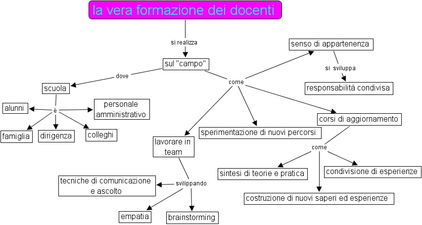 formazione, senso di appartenenza, scuola, la vera formazione dei docenti, famiglia, sperimentazione di nuovi percorsi, personale amministrativo, tecniche di comunicazione e ascolto, sul campo , alunni, lavorare in team, responsabilit� condivisa, corsi di aggiornamento, sintesi di teorie e pratica, empatia, dirigenza, costruzione di nuovi saperi ed esperienze, colleghi, condivisione di esperienze, brainstorming