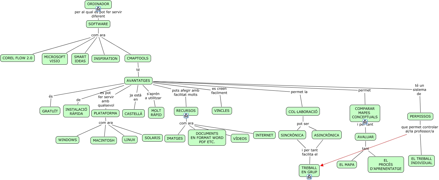 Este Cmap, tiene información relacionada con: ordinador, RECURSOS com ara INTERNET, AVALUAR tant EL MAPA, AVANTATGES permet COMPARAR MAPES CONCEPTUALS, RECURSOS com ara VÍDEOS, COL·LABORACIÓ pot ser SINCRÒNICA, SINCRÒNICA i per tant facilita el TREBALL EN GRUP, AVALUAR tant EL PROCÉS D'APRENENTATGE, PLATAFORMA com ara MACINTOSH, SOFTWARE com ara SMART IDEAS, AVANTATGES es pot fer servir amb qualsevol PLATAFORMA, AVANTATGES s'aprén a utilitzar MOLT RÀPID, AVANTATGES pots afegir amb facilitat molts RECURSOS, PLATAFORMA com ara WINDOWS, AVANTATGES permet la COL·LABORACIÓ, COMPARAR MAPES CONCEPTUALS i per tant AVALUAR, SOFTWARE com ara COREL FLOW 2.0, PERMISSOS que permet controlar al/la professor/a EL TREBALL INDIVIDUAL, AVANTATGES de INSTALACIÓ RÀPIDA, PERMISSOS que permet controlar al/la professor/a TREBALL EN GRUP, RECURSOS com ara DOCUMENTS EN FORMAT WORD PDF ETC.