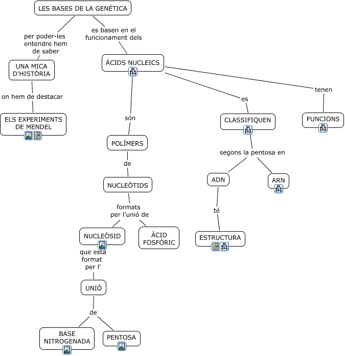 Este Cmap, tiene información relacionada con: bases_gen, ÀCIDS NUCLEICS tenen FUNCIONS, ÀCIDS NUCLEICS són POLÍMERS, UNIÓ de PENTOSA, UNA MICA D'HISTÒRIA on hem de destacar ELS EXPERIMENTS DE MENDEL, NUCLEÒTIDS formats per l'unió de ÀCID FOSFÒRIC, NUCLEÒSID que està format per l' UNIÓ, LES BASES DE LA GENÈTICA es basen en el funcionament dels ÀCIDS NUCLEICS, NUCLEÒTIDS formats per l'unió de NUCLEÒSID, LES BASES DE LA GENÈTICA per poder-les entendre hem de saber UNA MICA D'HISTÒRIA, CLASSIFIQUEN segons la pentosa en ADN, UNIÓ de BASE NITROGENADA, ÀCIDS NUCLEICS es CLASSIFIQUEN, ADN té ESTRUCTURA, POLÍMERS de NUCLEÒTIDS, CLASSIFIQUEN segons la pentosa en ARN