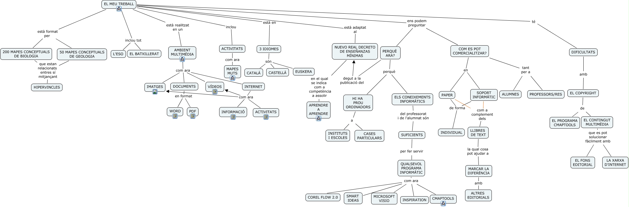 Este Cmap, tiene información relacionada con: meu_treball, SOPORT INFORMÀTIC com a complement dels LLIBRES DE TEXT, QUALSEVOL PROGRAMA INFORMÀTIC com ara CMAPTOOLS, EL MEU TREBALL està realitzat en un AMBIENT MULTIMÈDIA, EL MEU TREBALL inclou tot EL BATXILLERAT, QUALSEVOL PROGRAMA INFORMÀTIC com ara MICROSOFT VISIO, EL MEU TREBALL inclou ACTIVITATS, EL MEU TREBALL ens podem preguntar PERQUÈ ARA?, COM ES POT COMERCIALITZAR? tant per a PROFESSORS/RES, SOPORT INFORMÀTIC de forma INDIVIDUAL, COM ES POT COMERCIALITZAR? en PAPER, PAPER de forma INDIVIDUAL, DOCUMENTS en format WORD, MARCAR LA DIFERÈNCIA amb ALTRES EDITORIALS, INTERNET com ara IMATGES, INTERNET com ara ACTIVITATS, 3 IDIOMES són EUSKERA, LLIBRES DE TEXT la qual cosa pot ajudar a MARCAR LA DIFERÈNCIA, PERQUÈ ARA? degut a la publicació del NUEVO REAL DECRETO DE ENSEÑANZAS MÍNIMAS, HI HA PROU ORDINADORS a CASES PARTICULARS, AMBIENT MULTIMÈDIA com ara DOCUMENTS
