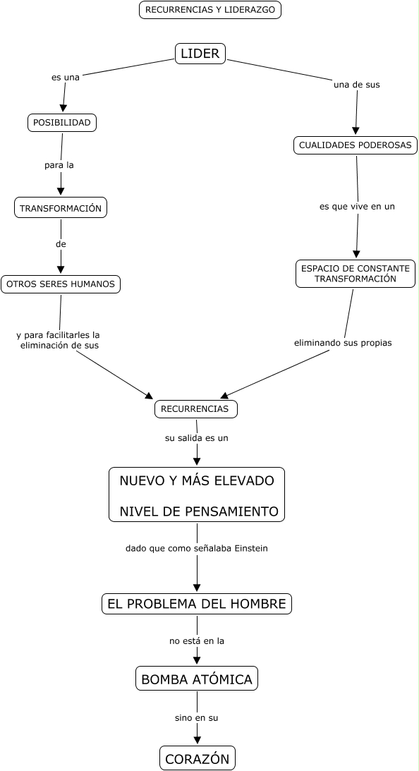 Este Cmap, tiene información relacionada con: Recurrencia y liderazgo, ESPACIO DE CONSTANTE TRANSFORMACIÓN eliminando sus propias RECURRENCIAS, NUEVO Y MÁS ELEVADO NIVEL DE PENSAMIENTO dado que como señalaba Einstein EL PROBLEMA DEL HOMBRE, POSIBILIDAD para la TRANSFORMACIÓN, LIDER una de sus CUALIDADES PODEROSAS, OTROS SERES HUMANOS y para facilitarles la eliminación de sus RECURRENCIAS, BOMBA ATÓMICA sino en su CORAZÓN, CUALIDADES PODEROSAS es que vive en un ESPACIO DE CONSTANTE TRANSFORMACIÓN, TRANSFORMACIÓN de OTROS SERES HUMANOS, EL PROBLEMA DEL HOMBRE no está en la BOMBA ATÓMICA, RECURRENCIAS su salida es un NUEVO Y MÁS ELEVADO NIVEL DE PENSAMIENTO, LIDER es una POSIBILIDAD