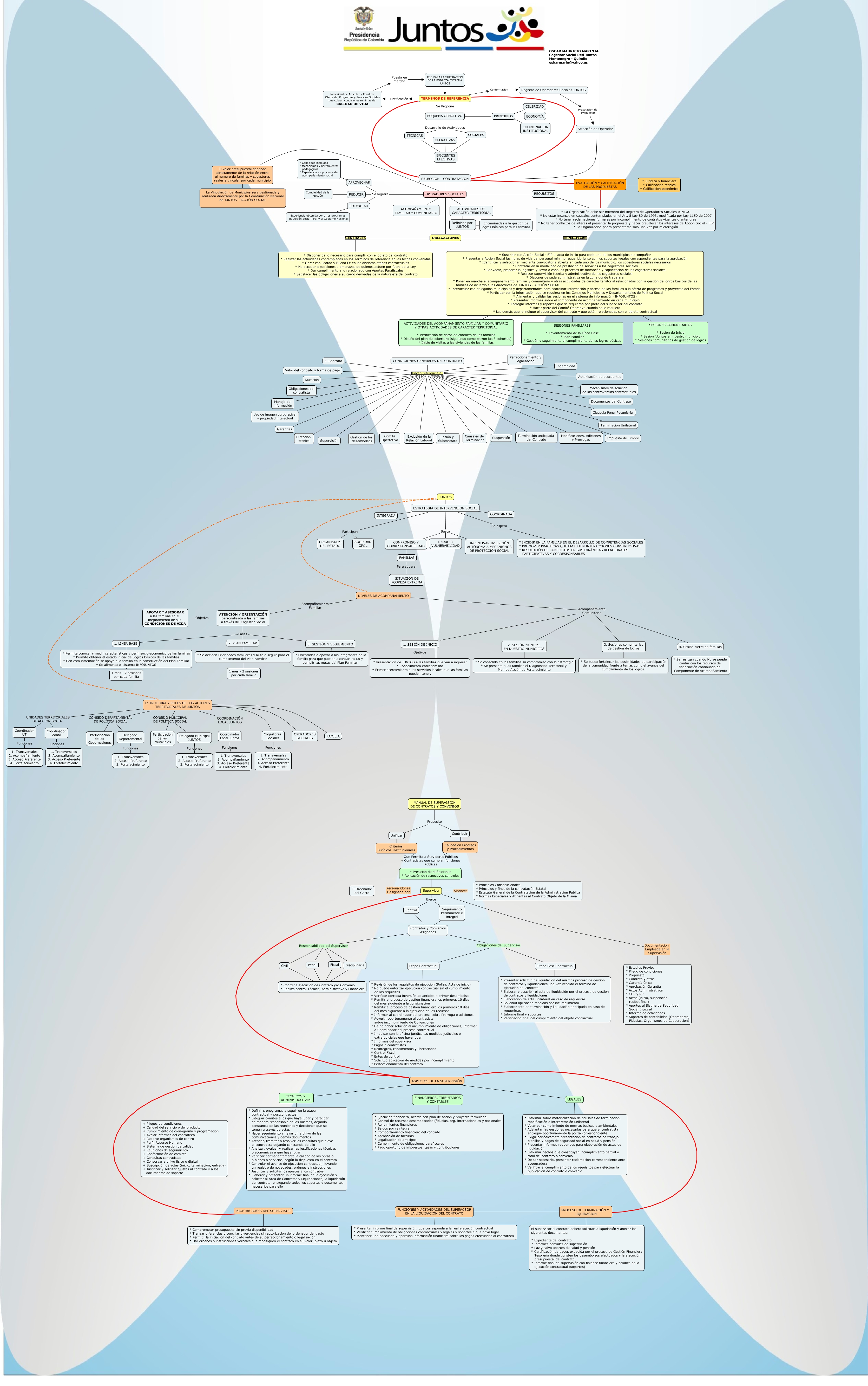 Este Cmap, tiene información relacionada con: TERMINOS DE REFERENCIA, CONDICIONES GENERALES DEL CONTRATO Hacen referencia a: Obligaciones del contratista, Coordinador UT Funciones 1. Transversales 2. Acompañamiento 3. Acceso Preferente 4. Fortalecimiento, Contratos y Convenios Asignados Obligaciones del Supervisor Etapa Post-Contractual, Registro de Operadores Sociales JUNTOS Presetación de Propuestas Selección de Operador, OPERADORES SOCIALES ???? El valor presupuestal depende directamente de la relación entre el número de familias y cogestores reales a vincular por cada municipio, ESTRUCTURA Y ROLES DE LOS ACTORES TERRITORIALES DE JUNTOS CONSEJO MUNICIPAL DE POLÍTICA SOCIAL Delegado Municipal JUNTOS, ESTRATEGIA DE INTERVENCIÓN SOCIAL Busca COMPROMISO Y CORRESPONSABILIDAD, OPERADORES SOCIALES ???? OBLIGACIONES, EVALUACIÓN Y CALIFICACIÓN DE LAS PROPUESTAS ???? * Jurídica y financiera * Calificación tecnica * Calificación económica, ATENCIÓN Y ORIENTACIÓN personalizada a las familias a través del Cogestor Social Fases 2. PLAN FAMILIAR, CONDICIONES GENERALES DEL CONTRATO Hacen referencia a: El Contrato, TERMINOS DE REFERENCIA Justificación Necesidad de Articular y Focalizar Oferta de Programas y Servicios Sociales que cubran condiciones mínimas de CALIDAD DE VIDA, ESTRUCTURA Y ROLES DE LOS ACTORES TERRITORIALES DE JUNTOS CONSEJO DEPARTAMENTAL DE POLÍTICA SOCIAL Participación de las Gobernaciones, CONDICIONES GENERALES DEL CONTRATO Hacen referencia a: Suspensión, CONDICIONES GENERALES DEL CONTRATO Hacen referencia a: Documentos del Contrato, Contratos y Convenios Asignados Responsabilidad del Supervisor Penal, ESTRATEGIA DE INTERVENCIÓN SOCIAL ???? INTEGRADA, Necesidad de Articular y Focalizar Oferta de Programas y Servicios Sociales que cubran condiciones mínimas de CALIDAD DE VIDA Puesta en marcha RED PARA LA SUPERACIÓN DE LA POBREZA EXTREMA JUNTOS, FINANCIEROS, TRIBUTARIOS Y CONTABLES ???? * Ejecución financiera, acorde con plan de acción y proyecto formulado * Control de recursos desembolsados (fiducias, org. internacionales y nacionales * Rendimientos financieros * Saldos por reintegrar * Comportamiento financiero del contrato * Aprobación de facturas * Legalización de anticipos * Cumplimiento de obligaciones parafiscales * Pago oportuno de impuestos, tasas y contribuciones, TERMINOS DE REFERENCIA Conformación Registro de Operadores Sociales JUNTOS