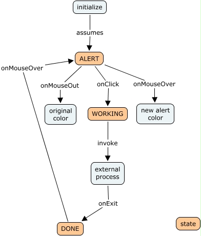 This Concept Map, created with IHMC CmapTools, has information related to: btnStates, ALERT onClick WORKING, external process onExit DONE, WORKING invoke external process, ALERT onMouseOut original color, DONE onMouseOver ALERT, ALERT onMouseOver new alert color, initialize assumes ALERT