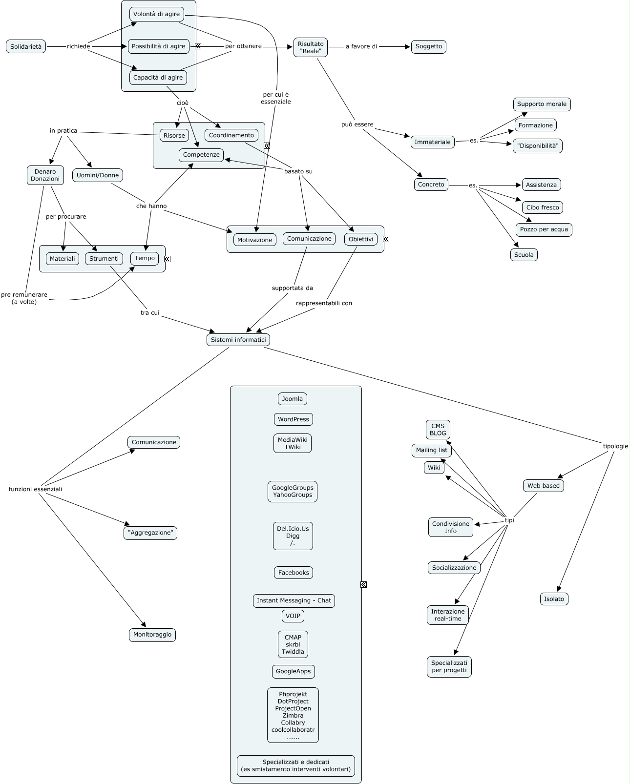 Questa Cmap, creata con IHMC CmapTools, contiene informazioni relative a: Analisi iniziale 2, Web based tipi Mailing list, Coordinamento basato su Competenze, Web based tipi CMS BLOG, Risultato "Reale" a favore di Soggetto, Risultato "Reale" può essere Immateriale, Sistemi informatici funzioni essenziali Comunicazione, Capacità di agire cioè Coordinamento, Sistemi informatici tipologie Isolato, Risultato "Reale" può essere Concreto, Capacità di agire cioè Competenze, Volontà di agire per cui è essenziale Motivazione, Coordinamento basato su Comunicazione, Immateriale es. "Disponibilità", Solidarietà richiede Possibilità di agire, Web based tipi Condivisione Info, Denaro Donazioni pre remunerare (a volte) Tempo, Coordinamento basato su Obiettivi, Web based tipi Socializzazione, Uomini/Donne che hanno Tempo, Immateriale es. Supporto morale