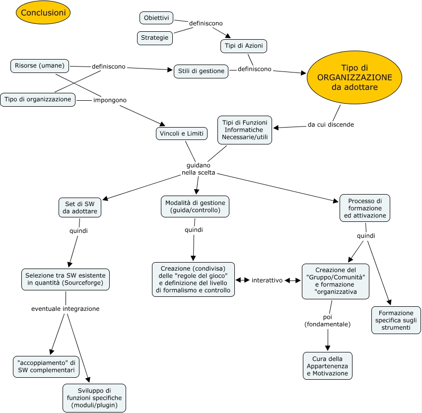 Questa Cmap, creata con IHMC CmapTools, contiene informazioni relative a: 5 conclusioni, Processo di formazione ed attivazione quindi Formazione specifica sugli strumenti, Tipi di Azioni definiscono Tipo di ORGANIZZAZIONE da adottare, Selezione tra SW esistente in quantità (Sourceforge) eventuale integrazione Sviluppo di funzioni specifiche (moduli/plugin), Tipi di Funzioni Informatiche Necessarie/utili guidano nella scelta Set di SW da adottare, Tipo di organizzazione definiscono Stili di gestione, Vincoli e Limiti guidano nella scelta Modalità di gestione (guida/controllo), Obiettivi definiscono Tipi di Azioni, Tipo di organizzazione impongono Vincoli e Limiti, Creazione del "Gruppo/Comunità" e formazione "organizzativa poi (fondamentale) Cura della Appartenenza e Motivazione, Creazione (condivisa) delle "regole del gioco" e definizione del livello di formalismo e controllo interattivo Creazione del "Gruppo/Comunità" e formazione "organizzativa, Risorse (umane) impongono Vincoli e Limiti, Tipi di Funzioni Informatiche Necessarie/utili guidano nella scelta Modalità di gestione (guida/controllo), Vincoli e Limiti guidano nella scelta Processo di formazione ed attivazione, Modalità di gestione (guida/controllo) quindi Creazione (condivisa) delle "regole del gioco" e definizione del livello di formalismo e controllo, Tipi di Funzioni Informatiche Necessarie/utili guidano nella scelta Processo di formazione ed attivazione, Tipo di ORGANIZZAZIONE da adottare da cui discende Tipi di Funzioni Informatiche Necessarie/utili, Vincoli e Limiti guidano nella scelta Set di SW da adottare, Set di SW da adottare quindi Selezione tra SW esistente in quantità (Sourceforge), Strategie definiscono Tipi di Azioni, Processo di formazione ed attivazione quindi Creazione del "Gruppo/Comunità" e formazione "organizzativa