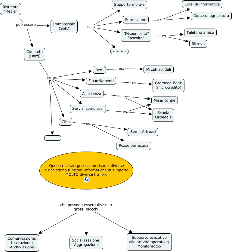 Questa Cmap, creata con IHMC CmapTools, contiene informazioni relative a: 3 Funzioni, Immateriale (Soft) es. "Disponibilità" "Ascolto", Assistenza es. Scuola Ospedale, Finanziamenti es. Grameen Bank (microcredito), Concreto (Hard) es. Cibo, Concreto (Hard) es. Servizi complessi, Risultato "Reale" può essere Concreto (Hard), Cibo es. Semi, Attrezzi, Formazione es. Corsi di informatica, "Disponibilità" "Ascolto" es. Telefono amico, Immateriale (Soft) es. .........., Concreto (Hard) es. Assistenza, Servizi complessi es. Misericordie, Beni es. Mrcati solidali, Formazione es. Corso di agricoltura, Servizi complessi es. Scuola Ospedale, Questi risultati gestiscono risorse diverse e richiedono funzioni Informatiche di supporto MOLTO diverse tra loro che possono essere divise in grossi blocchi Supporto esecutivo alle attività operative; Monitoraggio, Immateriale (Soft) es. Formazione, Questi risultati gestiscono risorse diverse e richiedono funzioni Informatiche di supporto MOLTO diverse tra loro che possono essere divise in grossi blocchi Socializzazione; Aggregazione, Concreto (Hard) es. ........., Concreto (Hard) es. Finanziamenti