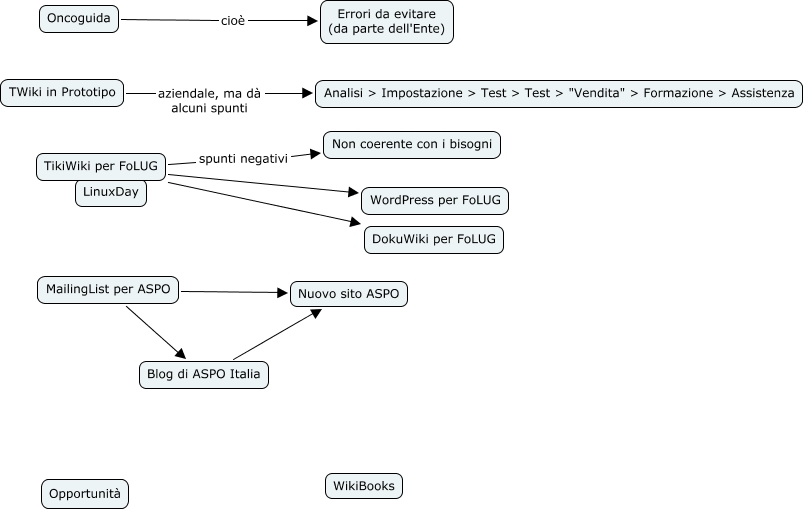 Questa Cmap, creata con IHMC CmapTools, contiene informazioni relative a: 99 Esempi, TikiWiki per FoLUG spunti negativi Non coerente con i bisogni, TWiki in Prototipo aziendale, ma dà alcuni spunti Analisi > Impostazione > Test > Test > "Vendita" > Formazione > Assistenza, TikiWiki per FoLUG DokuWiki per FoLUG, Oncoguida cioè Errori da evitare (da parte dell'Ente), MailingList per ASPO Nuovo sito ASPO, Blog di ASPO Italia Nuovo sito ASPO, MailingList per ASPO Blog di ASPO Italia, TikiWiki per FoLUG WordPress per FoLUG