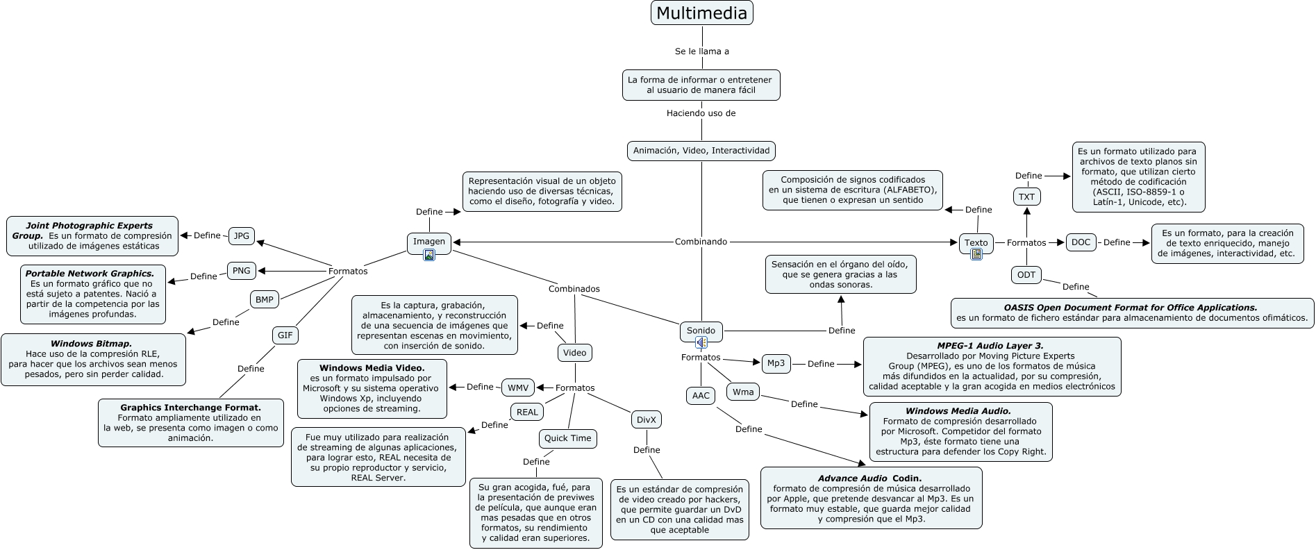 Este Cmap, tiene información relacionada con: CM-fagace-Multimedia, TXT Define Es un formato utilizado para archivos de texto planos sin formato, que utilizan cierto método de codificación (ASCII, ISO-8859-1 o Latín-1, Unicode, etc)., Imagen Define Representación visual de un objeto haciendo uso de diversas técnicas, como el diseño, fotografía y video., Mp3 Define MPEG-1 Audio Layer 3. Desarrollado por Moving Picture Experts Group (MPEG), es uno de los formatos de música más difundidos en la actualidad, por su compresión, calidad aceptable y la gran acogida en medios electrónicos, Imagen Formatos BMP, AAC Define Advance Audio Codin. formato de compresión de música desarrollado por Apple, que pretende desvancar al Mp3. Es un formato muy estable, que guarda mejor calidad y compresión que el Mp3., Sonido Define Sensación en el órgano del oído, que se genera gracias a las ondas sonoras., Video Formatos WMV, Imagen Combinados Video, Quick Time Define Su gran acogida, fué, para la presentación de previwes de película, que aunque eran mas pesadas que en otros formatos, su rendimiento y calidad eran superiores., Animación, Video, Interactividad Combinando Texto, Imagen Formatos JPG, Sonido Formatos Wma, Animación, Video, Interactividad Combinando Sonido, Multimedia Se le llama a La forma de informar o entretener al usuario de manera fácil, Video Formatos Quick Time, Texto Formatos ODT, ODT Define OASIS Open Document Format for Office Applications. es un formato de fichero estándar para almacenamiento de documentos ofimáticos., Video Define Es la captura, grabación, almacenamiento, y reconstrucción de una secuencia de imágenes que representan escenas en movimiento, con inserción de sonido., GIF Define Graphics Interchange Format. Formato ampliamente utilizado en la web, se presenta como imagen o como animación., Texto Formatos TXT