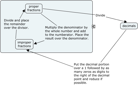 This Concept Map, created with IHMC CmapTools, has information related to: Numbers, proper fractions Multiply the denominator by the whole number and add to the numberator. Place the result over the denominator. improper fractions, decimals Put the decimal portion over a 1 followed by as many zeros as digits to the right of the decimal point and reduce if possible. improper fractions, improper fractions Divide and place the remainder over the divisor. proper fractions, proper fractions Divide decimals