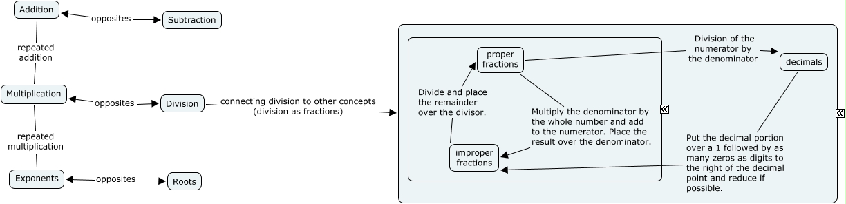 This Concept Map, created with IHMC CmapTools, has information related to: Operations&Numbers, Division connecting division to other concepts (division as fractions) fractions & decimals, Addition repeated addition Multiplication, proper fractions Division of the numerator by the denominator decimals, Multiplication repeated multiplication Exponents, decimals Put the decimal portion over a 1 followed by as many zeros as digits to the right of the decimal point and reduce if possible. improper fractions, proper fractions Multiply the denominator by the whole number and add to the numerator. Place the result over the denominator. improper fractions, improper fractions Divide and place the remainder over the divisor. proper fractions
