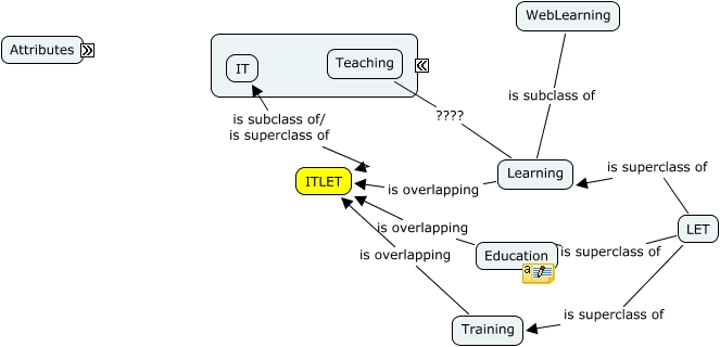 This Concept Map, created with IHMC CmapTools, has information related to: WG1_Start_Map, class has superclass, Teaching ???? Learning, LET is superclass of Training, LET is superclass of Learning, LET is superclass of Education, Training is overlapping ITLET, class has overlaps, Learning is overlapping ITLET, Education is overlapping ITLET, class has subclass, WebLearning is subclass of Learning, class may have disjoins