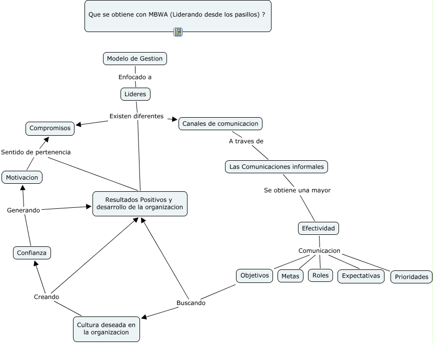 Este Cmap, tiene información relacionada con: MBWA, Las Comunicaciones informales Se obtiene una mayor Efectividad, Efectividad Comunicacion Metas, Objetivos Buscando Cultura deseada en la organizacion, Modelo de Gestion Enfocado a Lideres, Lideres Existen diferentes Compromisos, Confianza Generando Resultados Positivos y desarrollo de la organizacion, Efectividad Comunicacion Roles, Cultura deseada en la organizacion Creando Resultados Positivos y desarrollo de la organizacion, Efectividad Comunicacion Expectativas, Efectividad Comunicacion Objetivos, Motivacion Sentido de pertenencia Resultados Positivos y desarrollo de la organizacion, Motivacion Sentido de pertenencia Compromisos, Cultura deseada en la organizacion Creando Confianza, Objetivos Buscando Resultados Positivos y desarrollo de la organizacion, Efectividad Comunicacion Prioridades, Canales de comunicacion A traves de Las Comunicaciones informales, Lideres Existen diferentes Resultados Positivos y desarrollo de la organizacion, Confianza Generando Motivacion, Lideres Existen diferentes Canales de comunicacion