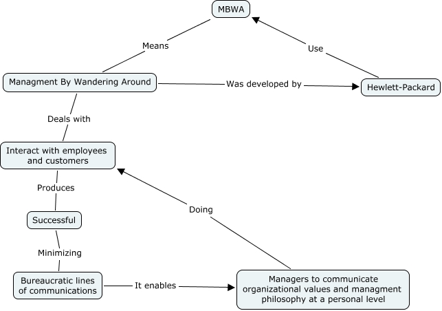 Este Cmap, tiene información relacionada con: MBWA, Managment By Wandering Around Was developed by Hewlett-Packard, Bureaucratic lines of communications It enables Managers to communicate organizational values and managment philosophy at a personal level, Successful Minimizing Bureaucratic lines of communications, Managers to communicate organizational values and managment philosophy at a personal level Doing Interact with employees and customers, Hewlett-Packard Use MBWA, Interact with employees and customers Produces Successful, MBWA Means Managment By Wandering Around, Managment By Wandering Around Deals with Interact with employees and customers