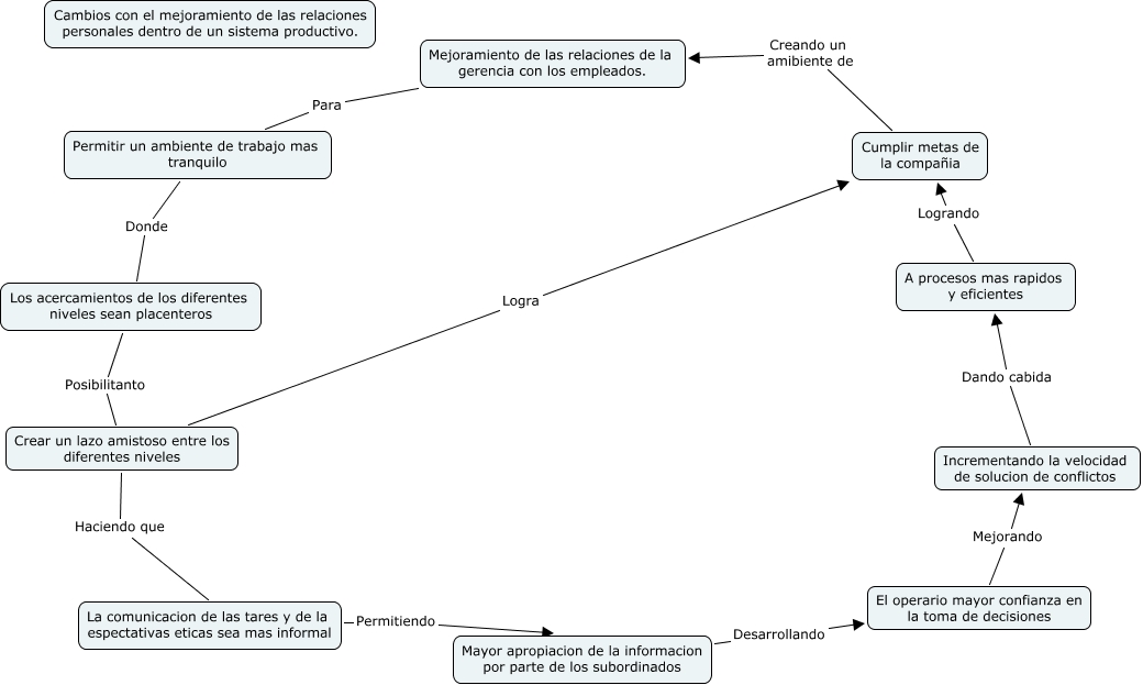 Este Cmap, tiene información relacionada con: MBWA, Permitir un ambiente de trabajo mas tranquilo Donde Los acercamientos de los diferentes niveles sean placenteros, A procesos mas rapidos y eficientes Logrando Cumplir metas de la compañia, El operario mayor confianza en la toma de decisiones Mejorando Incrementando la velocidad de solucion de conflictos, Crear un lazo amistoso entre los diferentes niveles Logra Cumplir metas de la compañia, Crear un lazo amistoso entre los diferentes niveles Haciendo que La comunicacion de las tares y de la espectativas eticas sea mas informal, Mayor apropiacion de la informacion por parte de los subordinados Desarrollando El operario mayor confianza en la toma de decisiones, La comunicacion de las tares y de la espectativas eticas sea mas informal Permitiendo Mayor apropiacion de la informacion por parte de los subordinados, Cumplir metas de la compañia Creando un amibiente de Mejoramiento de las relaciones de la gerencia con los empleados., Mejoramiento de las relaciones de la gerencia con los empleados. Para Permitir un ambiente de trabajo mas tranquilo, Incrementando la velocidad de solucion de conflictos Dando cabida A procesos mas rapidos y eficientes, Los acercamientos de los diferentes niveles sean placenteros Posibilitanto Crear un lazo amistoso entre los diferentes niveles