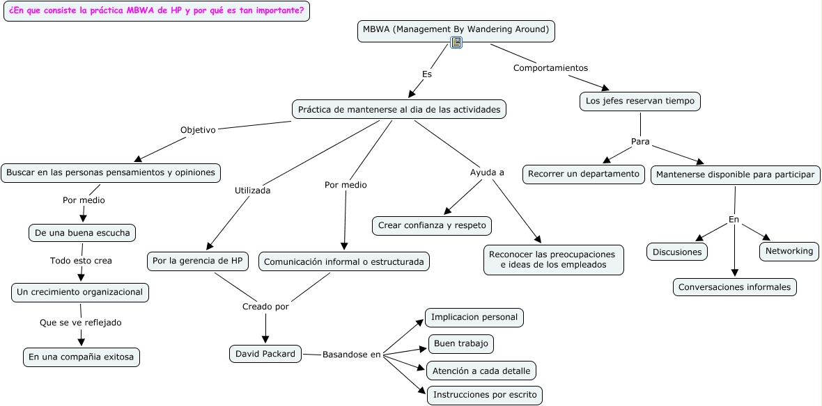 Este Cmap, tiene información relacionada con: MBWA (Management By Wandering Around) - TatiGaviria, Práctica de mantenerse al dia de las actividades Utilizada Por la gerencia de HP, Buscar en las personas pensamientos y opiniones Por medio De una buena escucha, Práctica de mantenerse al dia de las actividades Por medio Comunicación informal o estructurada, David Packard Basandose en Instrucciones por escrito, Por la gerencia de HP Creado por David Packard, Los jefes reservan tiempo Para Mantenerse disponible para participar, David Packard Basandose en Atención a cada detalle, Práctica de mantenerse al dia de las actividades Ayuda a Crear confianza y respeto, Comunicación informal o estructurada Creado por David Packard, Práctica de mantenerse al dia de las actividades Objetivo Buscar en las personas pensamientos y opiniones, MBWA (Management By Wandering Around) Es Práctica de mantenerse al dia de las actividades, David Packard Basandose en Buen trabajo, MBWA (Management By Wandering Around) Comportamientos Los jefes reservan tiempo, David Packard Basandose en Implicacion personal, Un crecimiento organizacional Que se ve reflejado En una compañia exitosa, Mantenerse disponible para participar En Networking, Los jefes reservan tiempo Para Recorrer un departamento, Mantenerse disponible para participar En Discusiones, De una buena escucha Todo esto crea Un crecimiento organizacional, Mantenerse disponible para participar En Conversaciones informales