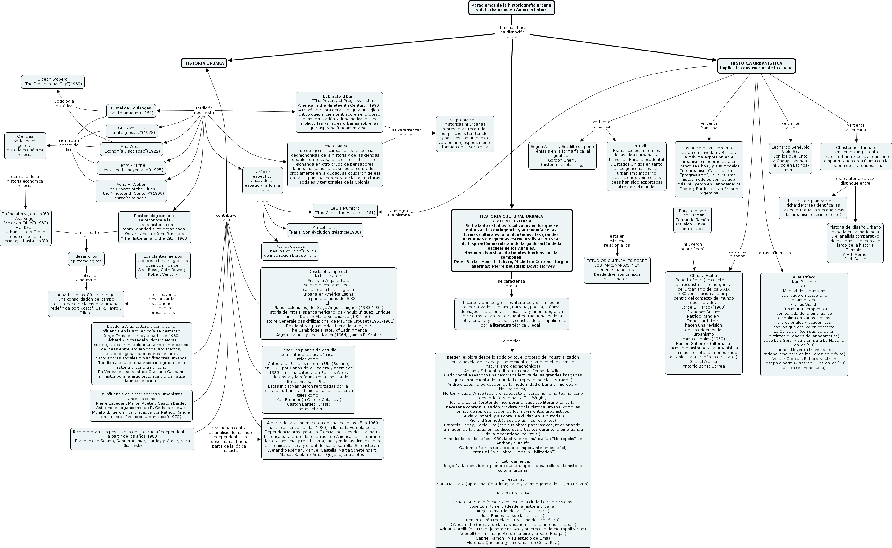 historiograf�a sobre urbanismo, richard morse trat� de ejemplificar c�mo las tendencias decimon�nicas de la historia y de las ciencias sociales europeas, tambi�n encontraron re- -sonancia en otro grupo de pensadores latinoamericanos que, sin estar centrados propiamente en la ciudad, se ocuparon de ella en tanto principal heredera de las estructuras sociales y territoriales de la colonia., historia cultural urbana y microhistoria se trata de estudios focalizados en los que se enfatizan la contingencia y autonom�a de las formas culturales, abandon�ndose las grandes narrativas o esquemas estructuralistas, ya sean de inspiraci�n marxista o de larga duraci�n de la escuela de los annales. hay una diversidad de fuentes te�ricas que la componen peter burke henri lefebvre michel de certeau jurgen habermas pierre bourdieu david harvey, henry pirenne les villes du moyen age (1925), max weber econom�a y sociedad (1922), la influencia de historiadores y urbanistas franceces como pierre lavedan, marcel poete y gaston bardet as� como el organicismo de p. geddes y lewis mumford, fueron interpretados por patricio randle en su obra evoluci�n urban�stica (1972), no propiamente hist�ricas ni urbanas representan recorridos por procesos territoriales y sociales con un nuevo vocabulario, especialmente tomado de la sociolog�a, peter hall establece los itinerarios de las ideas urbanas a trav�s de europa occidental y estados unidos en tanto polos generadores del urbanismo moderno describiendo c�mo estas ideas han sido exportadas al resto del mundo., historia urbanistica implica la construcci�n de la ciudad, desde la arquitectura y con alguna influencia en la arqueolog�a se destacan jorge enrique hardoy a partir de 1960. richard p. schaedel y richard morse sus objetivos eran facilitar un amplio intercambio de ideas entre arque�logos, arquitectos, antrop�logos, historiadores del arte, historiadores sociales y planificadores urbanos. tend�an a anudar una visi�n integrada de la historia urbana americana. en venezuela se destaca graziano gasparini en historiograf�a arquitect�nica y urban�stica latinoamericana. , ciencias sociales en general historia econ�mica y social, christopher tunnard tambi�n distingue entre historia urbana y del planeamiento emparentando esta �ltima con la historia de la arquitectura., car�cter espec�fico vinculado al espacio y la forma urbana, adna f. weber the growth of the cities in the nineteenth century (1899) estad�stica social, reinterpretan los postulados de la escuela independentista a partir de los a�os 1980 francisco de solano, gabrier alomar, hardoy y morse, nora clichevsky, desde los planes de estudio de instituciones acad�micas tales como c�tedra de urbanismo en la unl(rosario) en 1929 por carlos della paolera y apartir de 1933 la misma c�tedra en buenos aires. lucio costa y la reforma en la escuela de bellas artes, en brasil. estas iniciativas fueron reforzadas por la visita de urbanistas famosos a latinoam�rica tales como karl brunner (a chile y colombia) gaston bardet (brasil) joseph lebret, a partir de la visi�n marxista de finales de los a�os 1960 hasta comienzos de los 1980, la llamada escuela de la dependencia provey� a las ciencias sociales de una matriz hist�rica para entender el atraso de am�rica latina durante las eras colonial y republicana, incluyendo las dimensiones econ�mica, pol�tica y social del subdesarrollo. se destacan alejandro rofman, manuel castells, marta scheteingart, marcos kaplan y an�bal quijano, entre otos., en inglaterra, en los '60 asa briggs victorian cities (1963) h.j. dyos urban history group predominio de la sociolog�a hasta los '80, historia del planeamiento richard morse (identifica las bases territoriales y econ�micas del urbanismo decimon�nico), gideon sjoberg the preindustrial city (1960), a partir de los '80 se produjo una consolidaci�n del campo disciplinario de la historia urbana redefinida por kostof, celik, favro y gillete., patrick geddes cities in evolution (1915) de inspiraci�n bergsoniana, seg�n anthony sutcliffe se pone �nfasis en la forma f�sica, al igual que gordon cherry (historia del planning), leonardo ben�volo paolo sica son los que junto a choay m�s han influido en latinoa- -m�rica, lewis mumford the city in the history (1961), e. bradford burn en the poverty of progress. latin america in the nineteenth century (1990) a trav�s de esta obra configura un tejido cr�tico que, si bien centrado en el proceso de modernizaci�n latinoamericano, lleva impl�cito las variables urbanas sobre las que aspiraba fundamentarse. , enry lefebvre gino germani fernando ram�n osvaldo sunkel, entre otros, el austr�aco karl brunner y su manual de urbanismo publicado en castellano el americano francis violich ofreci� una perspectiva comparada de la emergente disciplina en varios medios profesionales y acad�micos con los que estuvo en contacto le corbusier (con sus obras en distintas ciudades de latinoam�rica) jos� luis sert (y su plan para la habana en los '50) hannes meyer (a trav�s de su racionalismo hard de izquierda en m�xico) walter gropius, richard neutra y joseph alberts (visitaron cuba en los '40) violich (en venezuela) , los primeros antecedentes estan en lavedan y bardet. la m�xima expresi�n en el urbanismo moderno esta en francoise choay y sus modelos preurbanismo , urbanismo progresismo , culturalismo estos modelos son los que m�s influyeron en latinoam�rica poete y bardet visitan brasil y argentina, desde el campo del la historia del arte y la arquitectura se han hecho aportes al campo de la historiograf�a urbana en am�rica latina en la primera mitad del s xx. ej. planos coloniales, de diego angulo i�iguez (1933-1939) historia del arte hispanoamericano, de angulo i�iguez, enrique marco dorta y mario buschiazzo (1954-56) histoire g�n�rale des civilizations, de maurice crouzet (1953-196