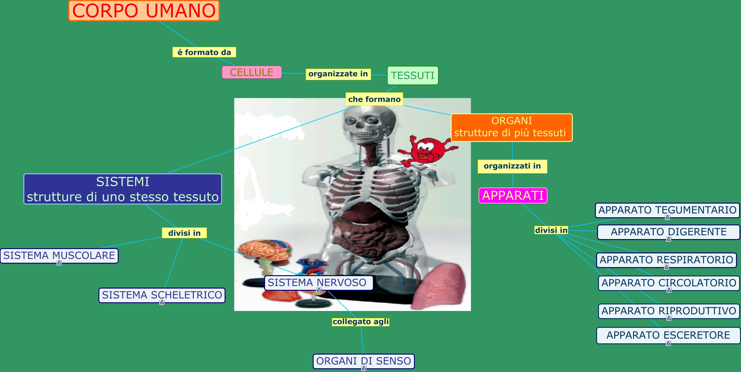 Questa Cmap, creata con IHMC CmapTools, contiene informazioni relative a: CORPO UMANO, SISTEMI strutture di uno stesso tessuto divisi in SISTEMA SCHELETRICO, APPARATI divisi in APPARATO CIRCOLATORIO, TESSUTI che formano SISTEMI strutture di uno stesso tessuto, SISTEMA NERVOSO collegato agli ORGANI DI SENSO, TESSUTI che formano ORGANI strutture di più tessuti, CORPO UMANO é formato da CELLULE, APPARATI divisi in APPARATO TEGUMENTARIO, APPARATI divisi in APPARATO ESCERETORE, SISTEMI strutture di uno stesso tessuto divisi in SISTEMA NERVOSO, APPARATI divisi in APPARATO DIGERENTE, CELLULE organizzate in TESSUTI, APPARATI divisi in APPARATO RESPIRATORIO, ORGANI strutture di più tessuti organizzati in APPARATI, APPARATI divisi in APPARATO RIPRODUTTIVO, SISTEMI strutture di uno stesso tessuto divisi in SISTEMA MUSCOLARE